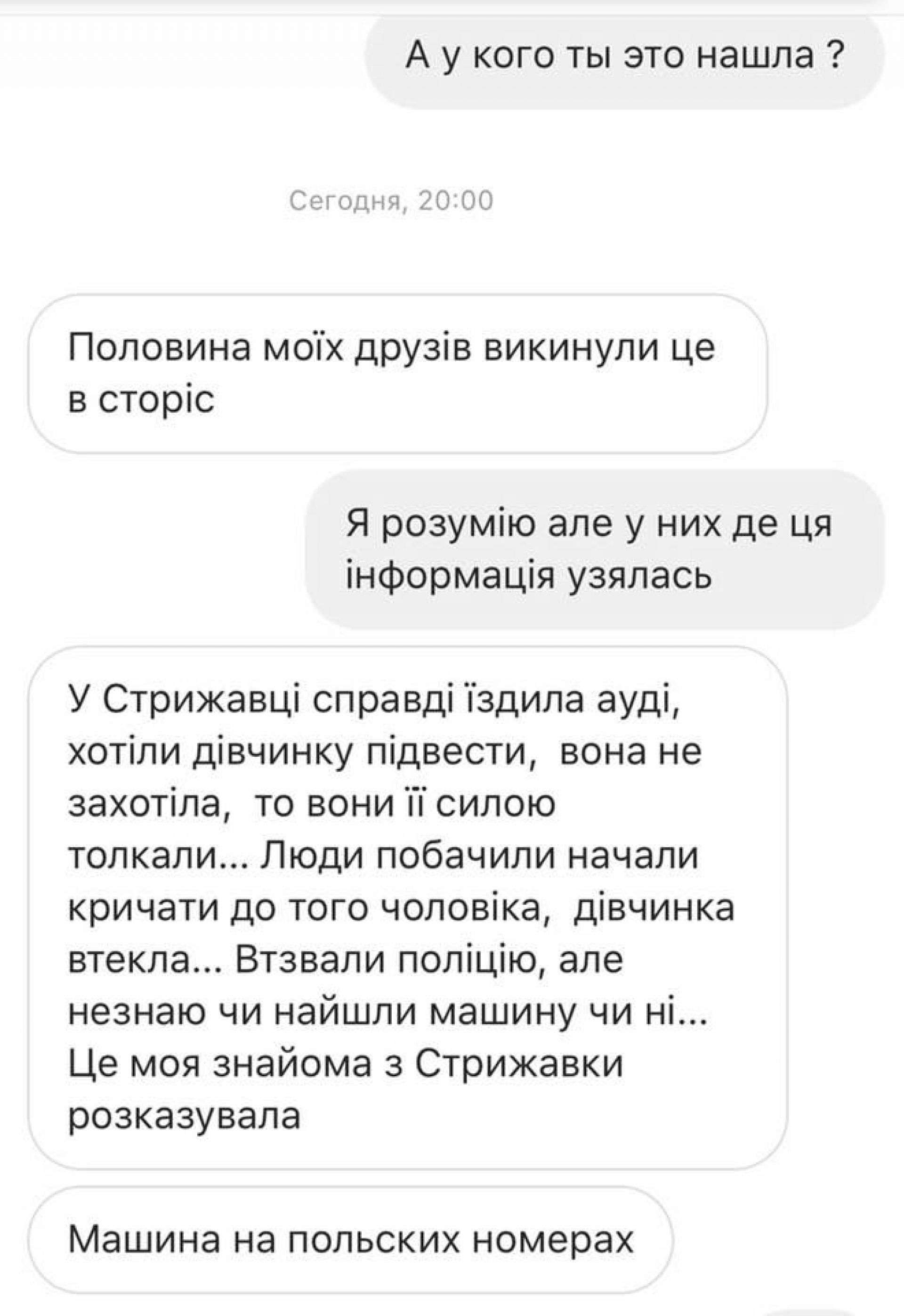 Їй відповіли, що «вже два місяці по всій країні колесить чорна «Ауді», ніби чорний плащ на колесах». Її «бачили» на Волині, Хмельниччині, Тернопільщині, в Закарпатті та біля Херсону і ще деінде. Всі населені пункти, які фігурували в постах про кіднепінг, довго перелічувати. Паралельно на тамтешніх новинних сайтах виходять заперечення місцевої поліції.