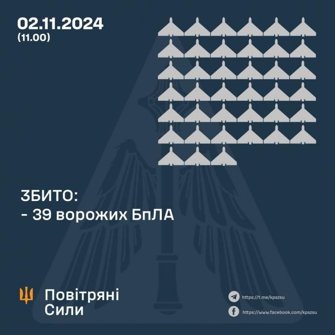 Станом на 11.00 підтвердили збиття 39 ворожих БпЛА у Кіровоградській, Київській, Сумській та Полтавській областях. 21 безпілотник локаційно втратили, 5 БпЛА — повернулись у росію. Про це інформують Повітряні сили.