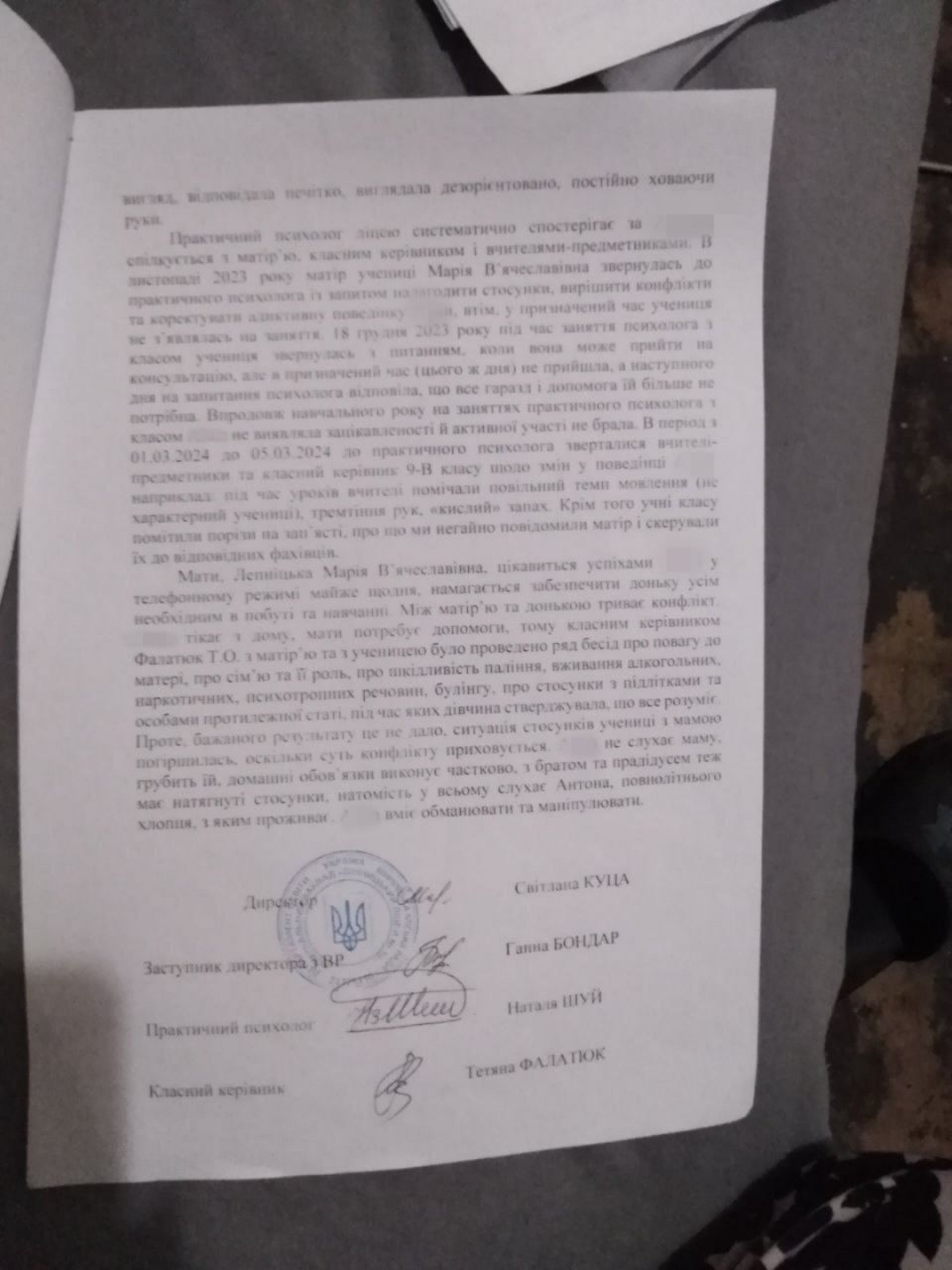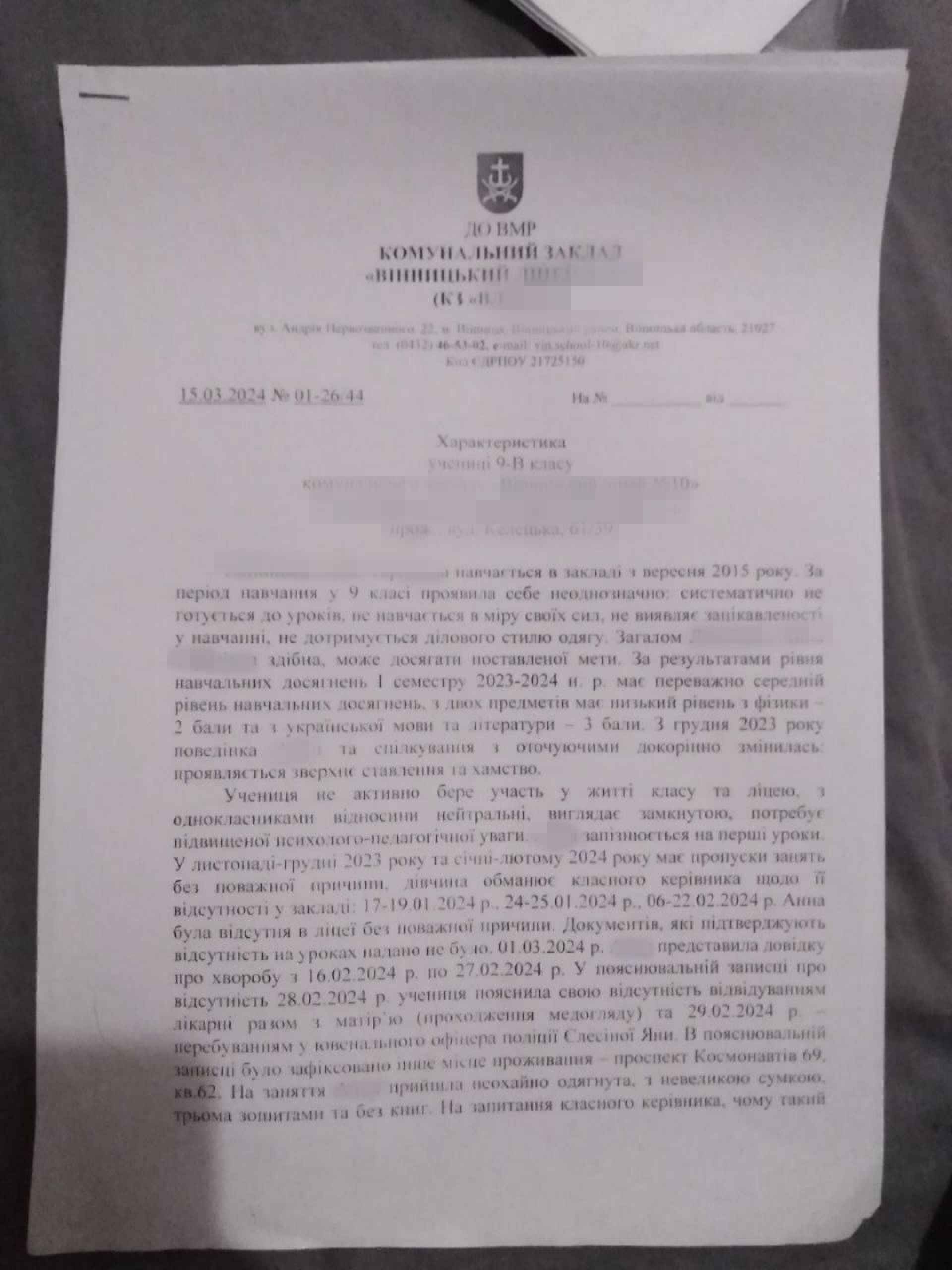 Вище додали фото характеристики школярки та її матері, які подали від ліцею, в якому навчалася дівчина.