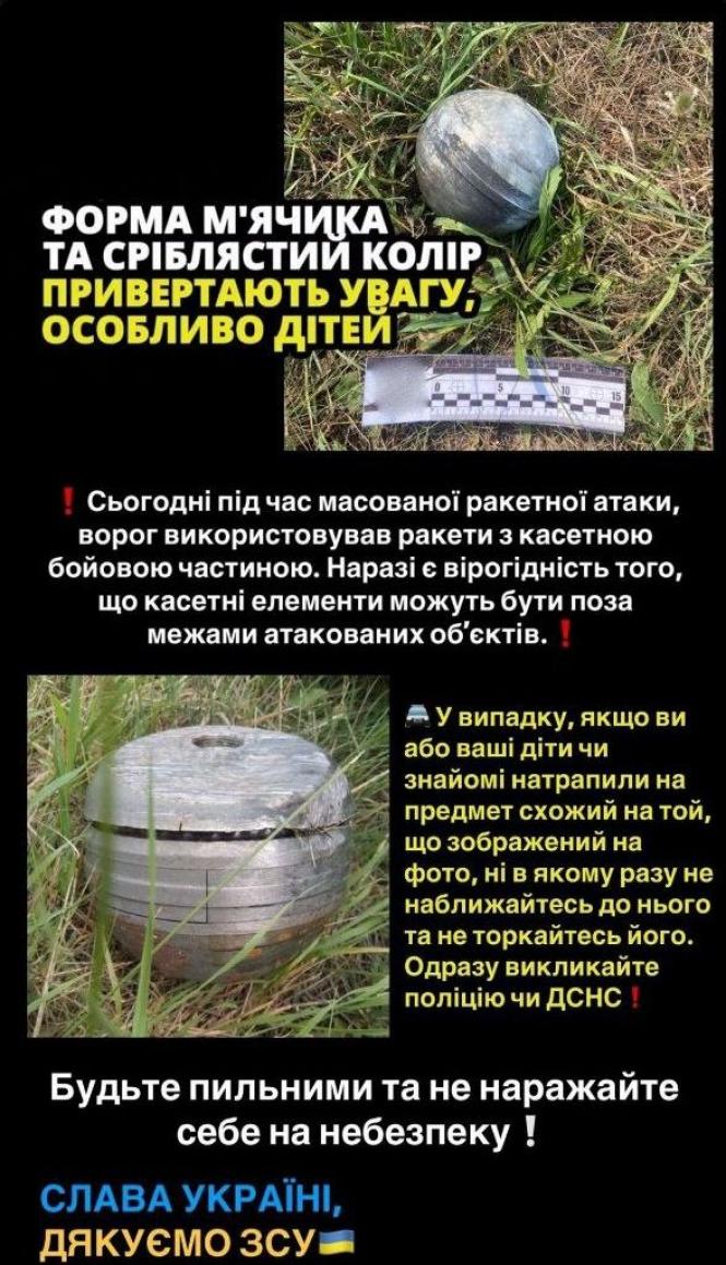 - Форма м'ячика та срібний колір, що привертає увагу. На Вінниччині вперше знайшли небезпечні боєприпаси від ворожих ракет. Вони дуже чутливі і можуть вибухнути від найменшого дотику.