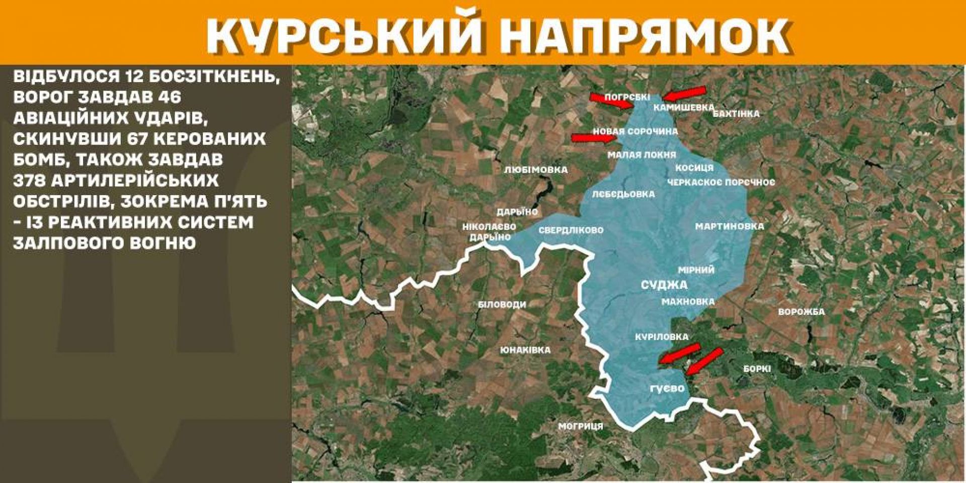 Минулої доби на Курському напрямку відбулося 12 боєзіткнень, ворог завдав 46 авіаційних ударів, скинувши 67 керованих бомб, також завдав 378 артилерійських обстрілів, зокрема п’ять — із реактивних систем залпового вогню.