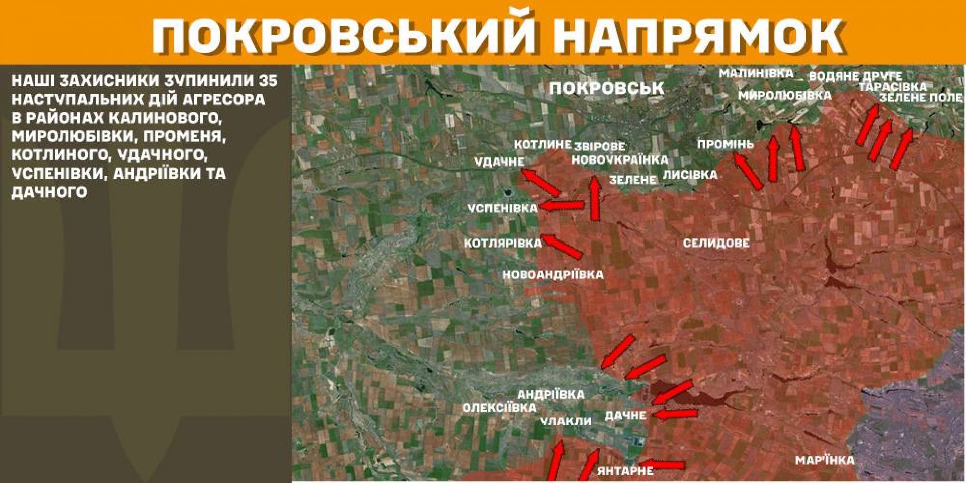 На Покровському напрямку наші захисники зупинили 35 наступальних дій агресора в районах Калинового, Миролюбівки, Променя, Котлиного, Удачного, Успенівки, Андріївки та Дачного.