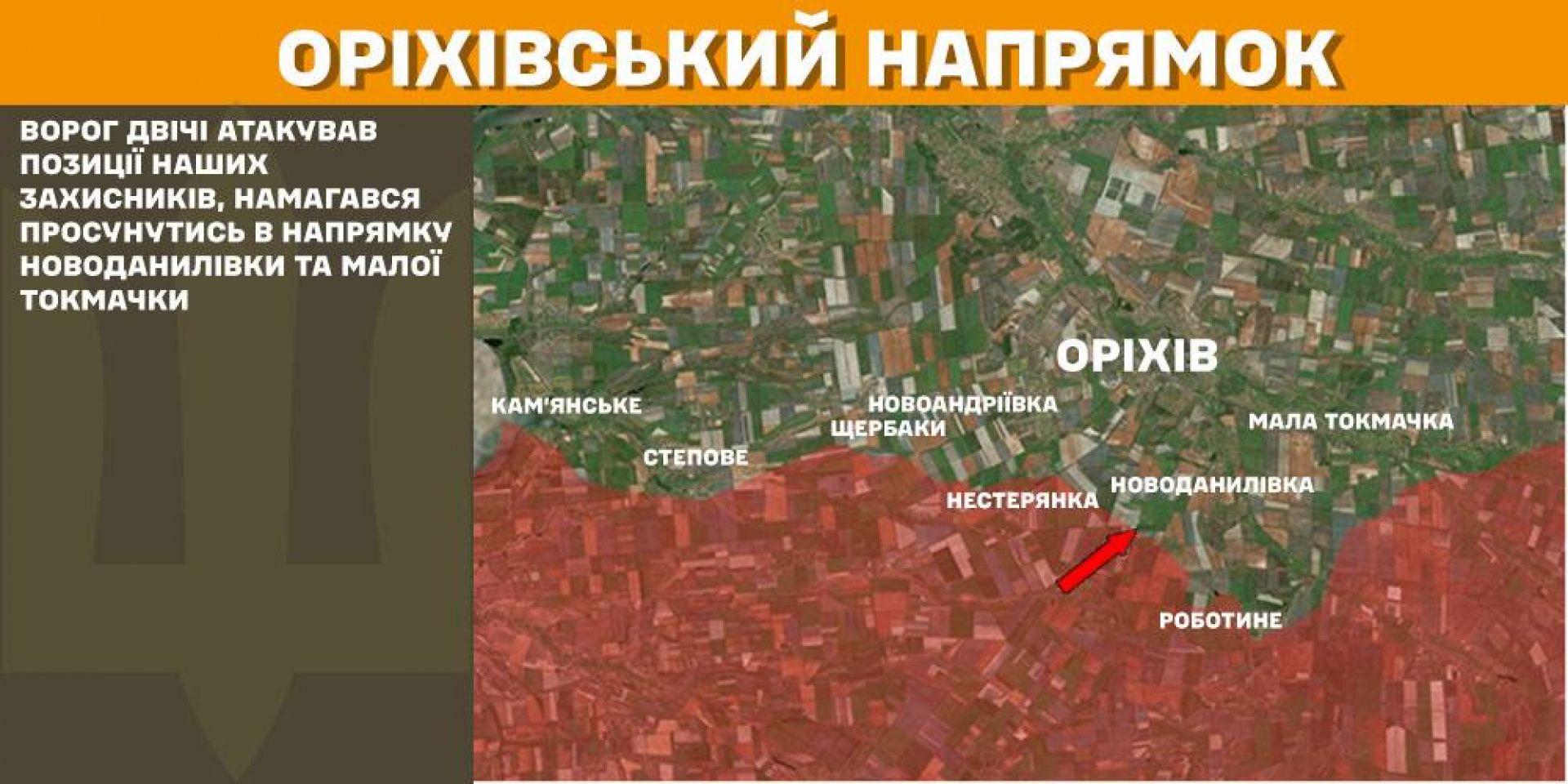 На Оріхівському напрямку ворог двічі атакував позиції наших захисників, намагався просунутись в напрямку Новоданилівки та Малої Токмачки.
