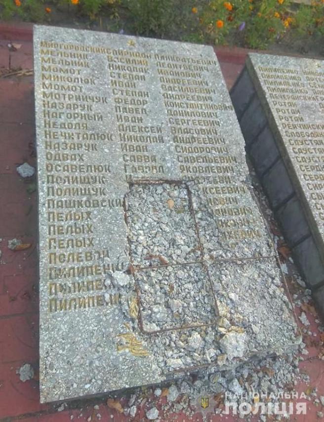 До поліції надійшло повідомлення від селищного голови про те, що у селищі Дашів невідомий пошкодив бетонну плиту, на якій викарбувані прізвища загиблих воїнів у Другій Світовій війні.