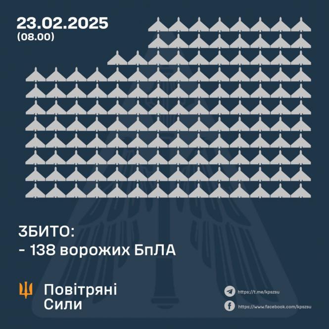 - У ніч на 23 лютого 2025 року російські війська здійснили масовану атаку безпілотниками по території України. Сили оборони України збили 138 ворожих БПЛА.