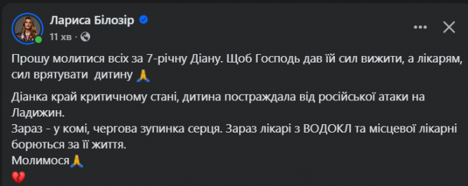 Лариса Білозір написала: «Прошу молитися всіх за 7-річну Діану. Щоб Господь дав їй сил вижити, а лікарям, сил врятувати дитину. Діанка край критичному стані, дитина постраждала від російської атаки на Ладижин. Зараз — у комі, чергова зупинка серця. Зараз лікарі з ВОДОКЛ та місцевої лікарні борються за її життя. Молимося».