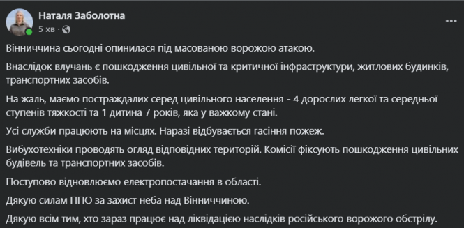 - Нічна масована атака ворога на Вінниччину призвела до трагічних наслідків. Є поранені серед цивільного населення. На жаль, постраждали п'ятеро людей, серед них — 7-річна дитина, яка померла у реанімації.