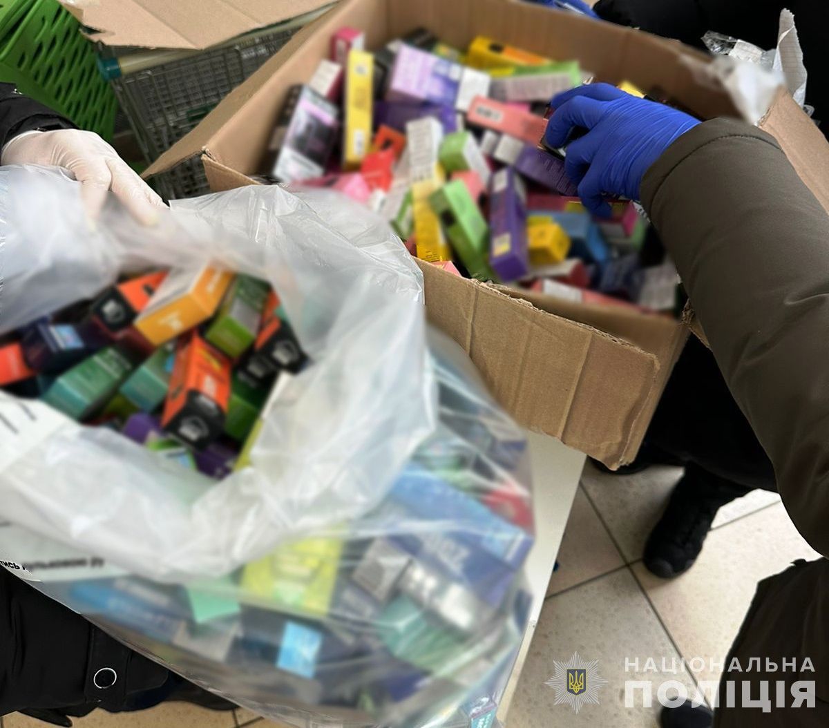 - Вилучили майже 85 000 пачок сигарет невідомого походження, понад 600 електронних цигарок, чорнові записи та телефони.