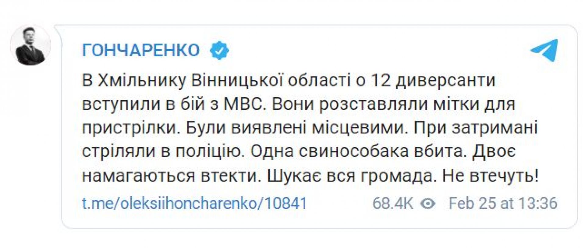 «В Хмільнику Вінницької області о 12 диверсанти вступили в бій з МВС. Вони розставляли мітки для пристрілки. Були виявлені місцевими. При затримані стріляли в поліцію. Одна свинособака вбита. Двоє намагаються втекти. Шукає вся громада. Не втечуть!»