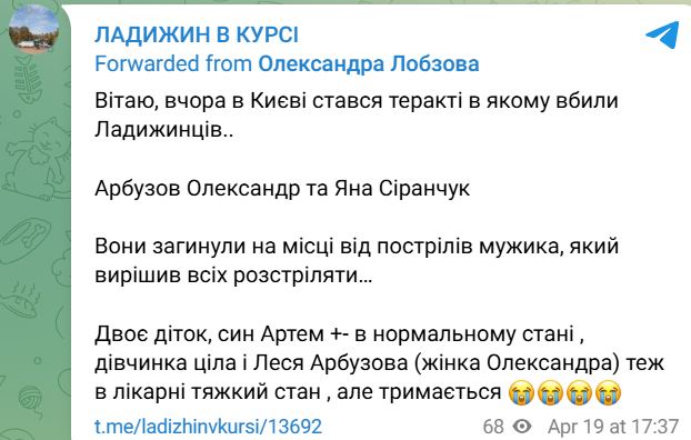 Жахливий напад у столиці, що стався 18 квітня, відгукнувся болем у Вінницькій області. Стало відомо, що серед жертв 58-річного терориста опинилися жителі Ладижина — Олександр Арбузов та сестра його дружини, Яна Сіранчук. Вони загинули на місці, намагаючись захистити своїх дітей від куль вбивці.