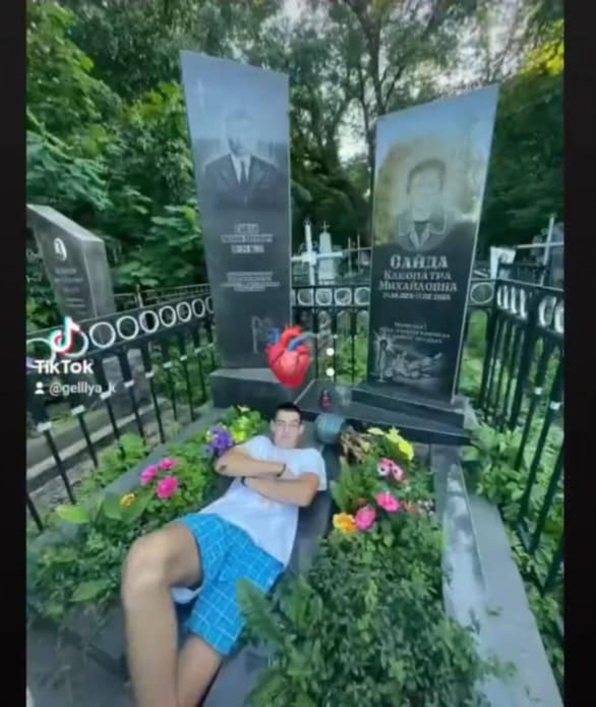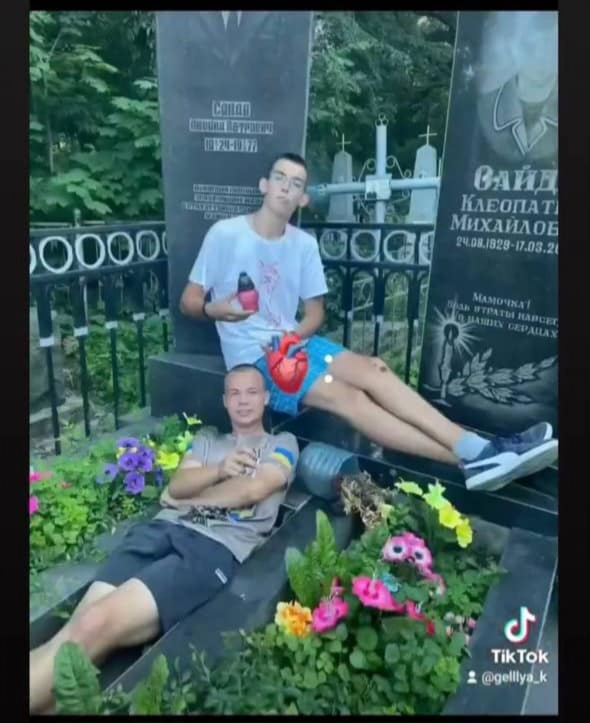 На сторінці «Дорожний контроль Вінниця» опублікували скріни відео з Тік-Ток. На них видно двох юнаків, які позують на фоні надгробка. Сидять хлопці просто на могилі. Ще один скрін — підлітки валяються в обіймах на могилі. Додаємо ці світлини з допису: