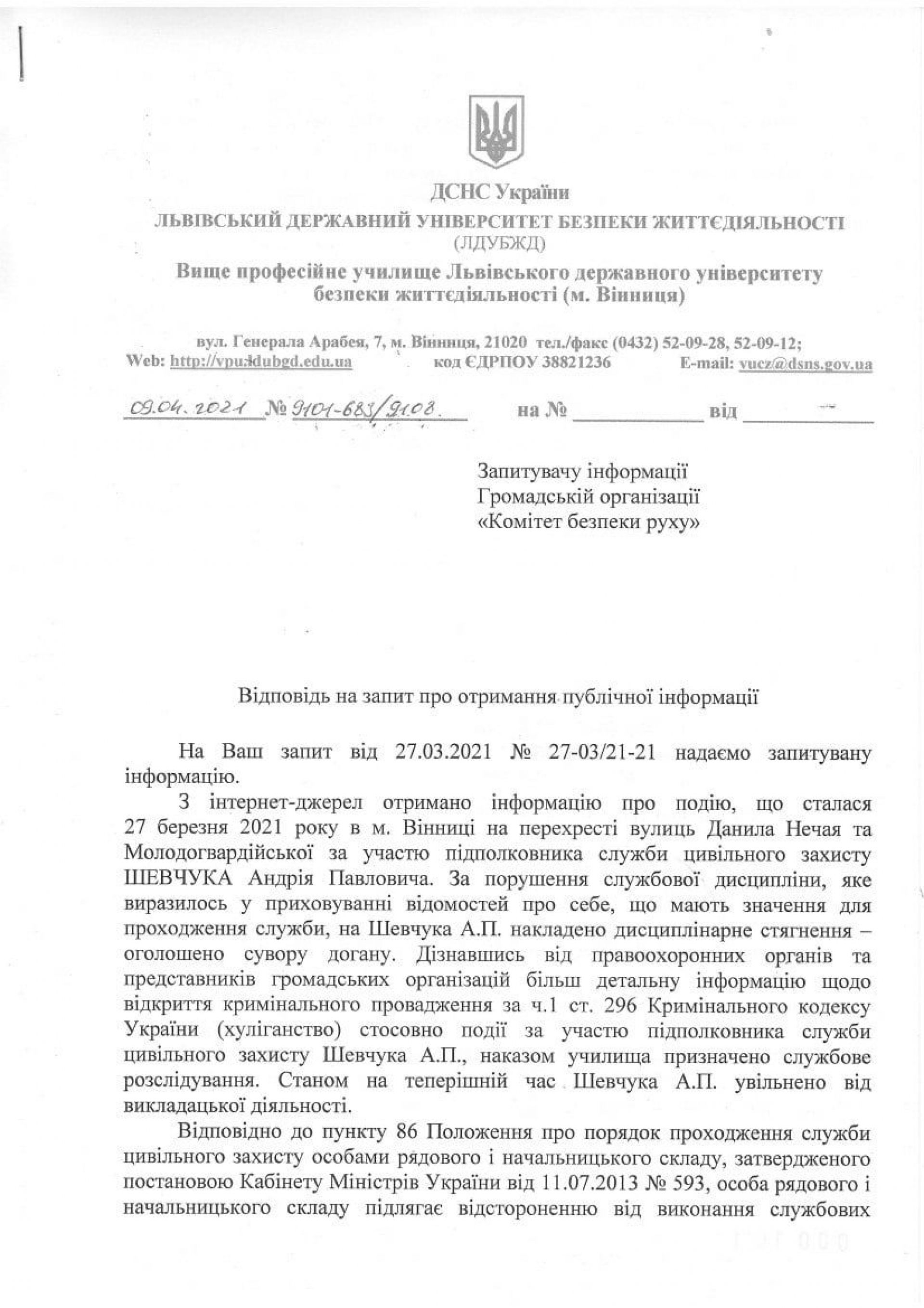 Активіст Володимир Черкас подав запит за місцем роботи підполковника і отримав на нього відповідь. Вона з вінницького училища безпеки життєдіяльності, бо фігурант конфлікту зі стріляниною працює там викладачем.