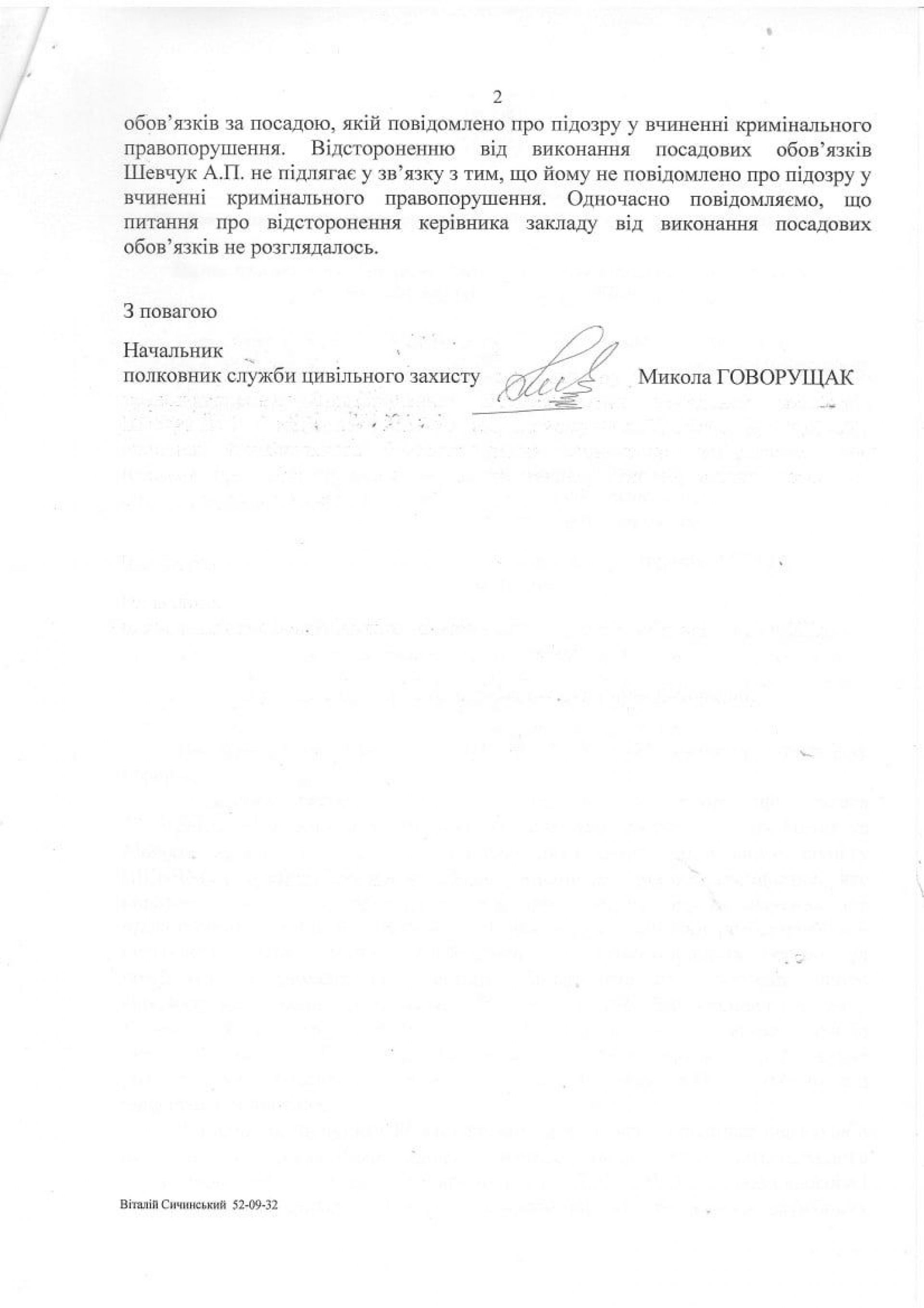До свого посту Черкас додав офіційну відповідь. У документі читаємо, що Андрій Шемчук не отримував підозру про злочин, тому з роботи його ніхто не звільняв. Одночасно додають, що підполковнику винесли сувору догану і не схвалюють його дій.