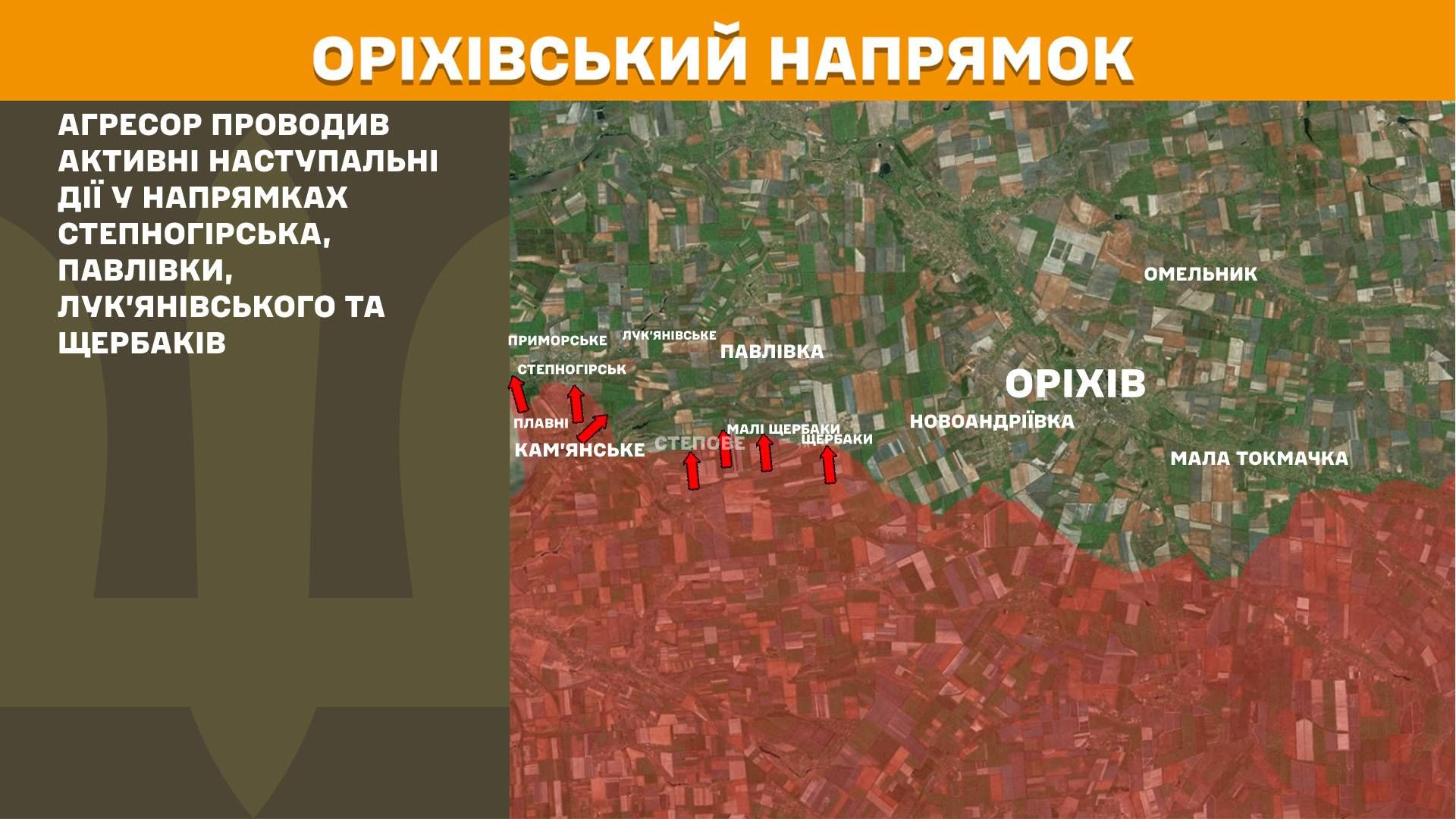 На Оріхівському напрямку загарбники вели наступальні дії в бік Степногірська та Павлівки, проте успіху не мали. На Куп’янському, Лиманському та Слов’янському напрямках Сили оборони загалом відбили 15 атак, зупинивши спроби ворога вклинитися в наші оборонні рубежі. Водночас на Краматорському та Придніпровському напрямках наступальних дій ворога протягом доби не було.