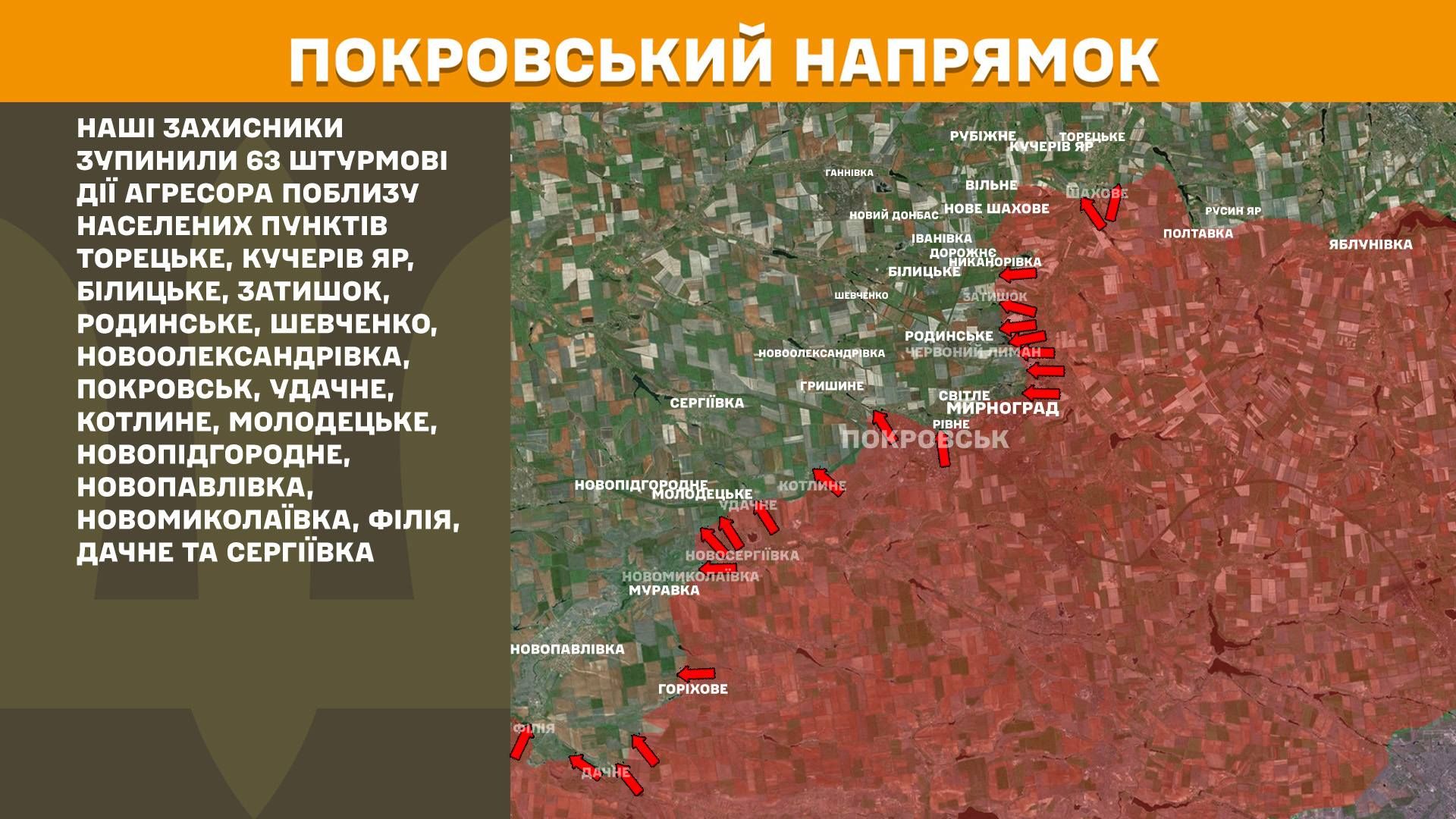 На Покровському напрямку українські воїни зупинили 63 штурмові дії агресора. Ворог намагався прорвати оборону поблизу Торецького, Покровська, Удачного та Дачного. Не менш складною залишається ситуація на Гуляйпільському напрямку, де окупанти провели 37 атак у бік Добропілля, Успенівки та Залізничного. Також активні бої тривають на Костянтинівському та Олександрівському напрямках — там захисники відбили 49 ворожих атак.