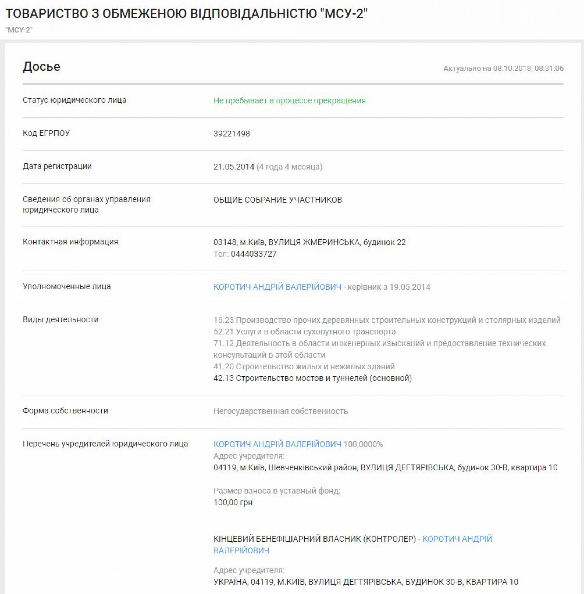 Ще 15 листопада 2016 року Департамент капітального будівництва міськради та ТОВ «МСУ-2», директором якого є Андрій Коротич, уклади договір на суму 56,5 мільйонів гривень про ремонт Київського мосту. Саме про частину грошей йде мова.