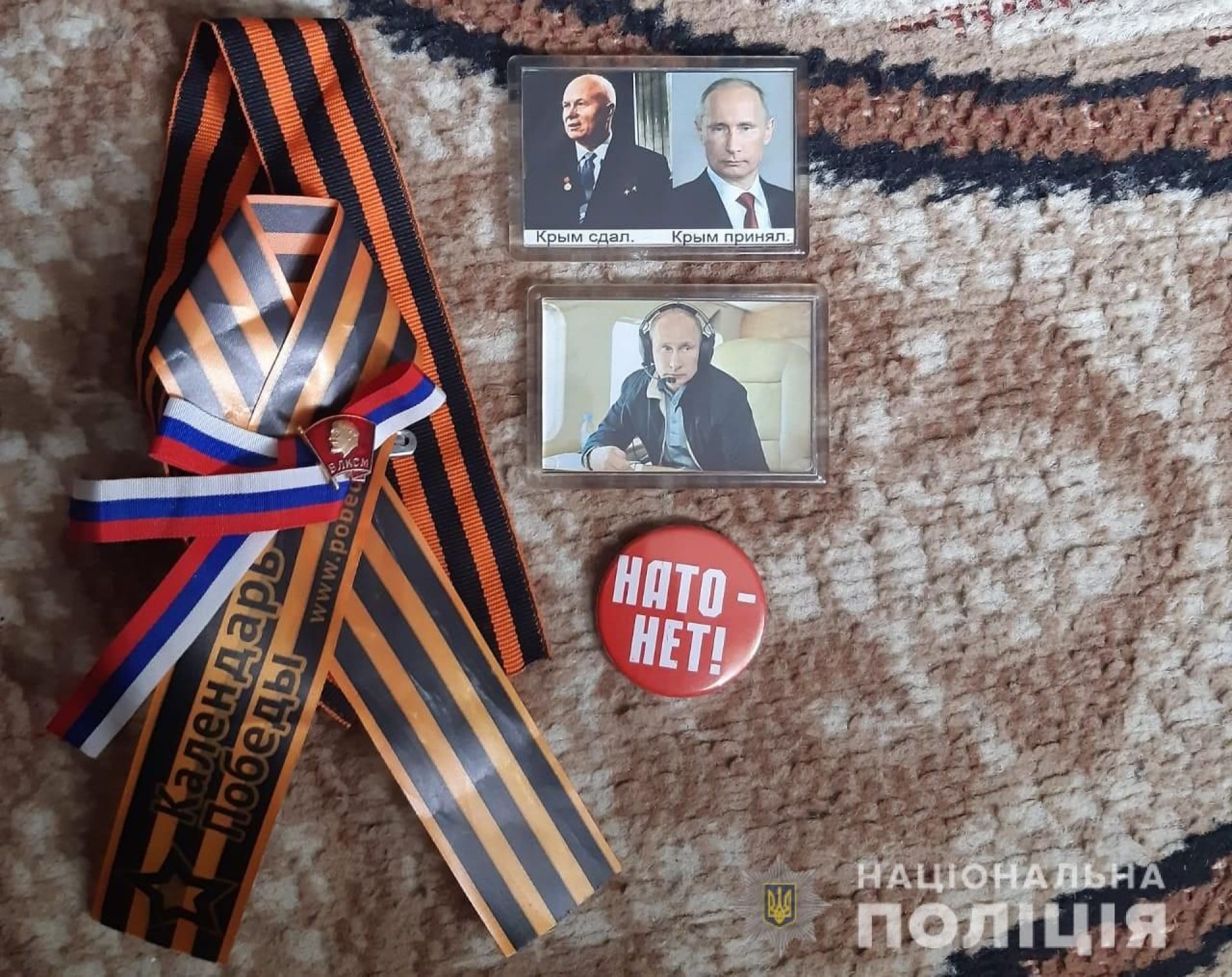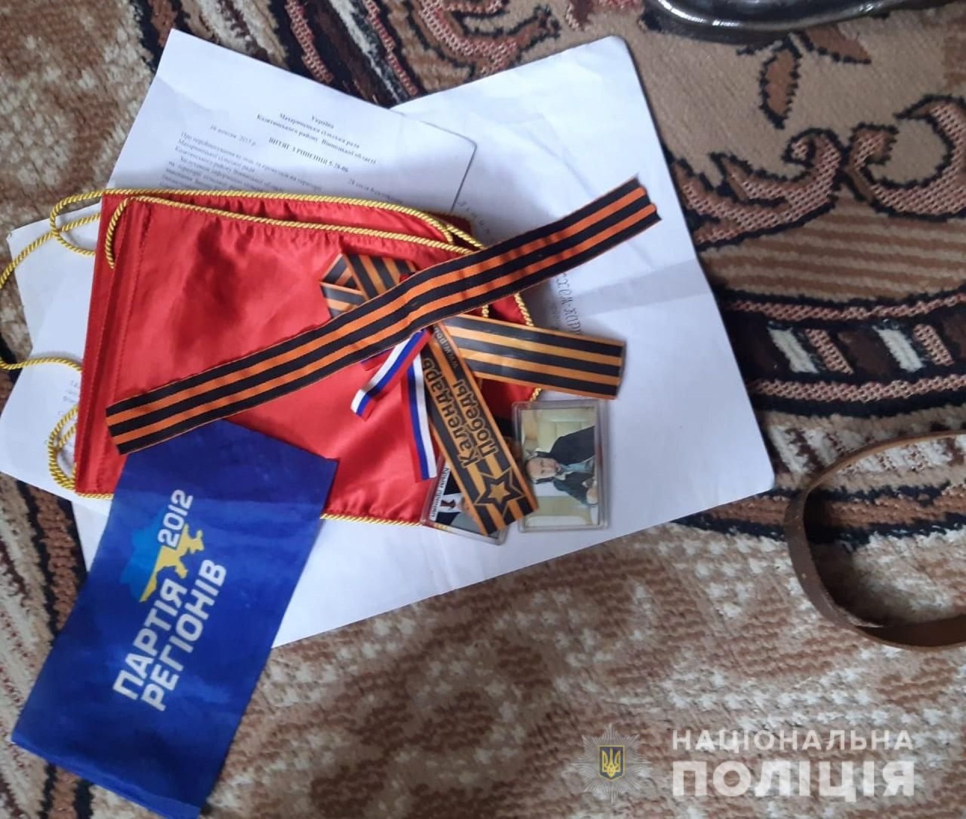 — У його домоволодінні поліцейські вилучили пропагандистську атрибутику, зокрема, георгіївські стрічки, прапорці СРСР, значки із зображенням президента країни агресора, зброю та бінокль, інші речові докази, — кажуть у відділі комунікації поліції Вінницької області.