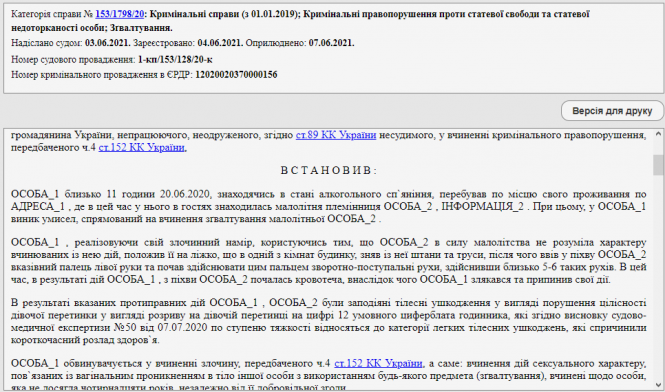 «Чоловік ввів у піхву дівчинки вказівний палець лівої руки та почав здійснювати цим пальцем зворотно-поступальні рухи, здійснивши близько 5-6 таких рухів. В цей час, в результаті дій злочинця, з піхви дівчинки почалась кровотеча, внаслідок чого дядько злякався та припинив свої дії», — пишуть подробиці злочину.