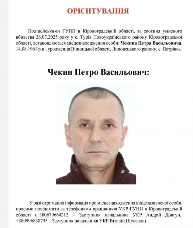 Поліція розшукує 64-річного Петра Чекина — уродженця Вінницької області, раніше судимого за вбивство. Його підозрюють у причетності до особливо жорстокого злочину на Черкащині.