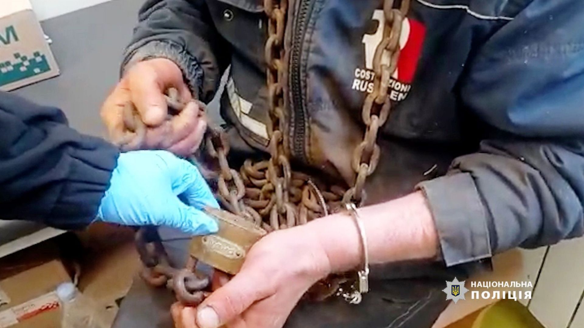 Потерпілий врятувався втечею. Кайданки та прикріплений до нього ланцюг, яких втікач не міг сам позбутися, демонтували рятувальники.