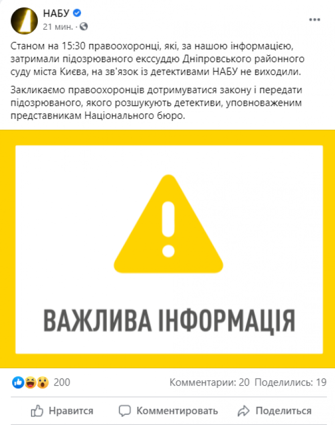 — Станом на 15.30 правоохоронці, які, за нашою інформацією, затримали підозрюваного екссуддю Дніпровського районного суду міста Києва, на зв'язок із детективами НАБУ не виходили. Закликаємо правоохоронців дотримуватися закону і передати підозрюваного, якого розшукують детективи, уповноваженим представникам Національного бюро, — повідомило на своїй сторінці у фейсбук НАБУ.