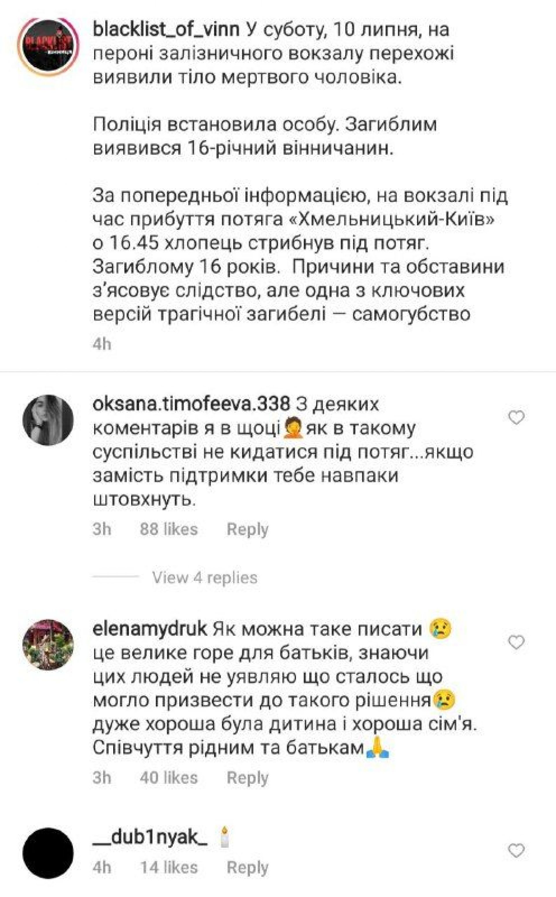 — Хлопцю було 16 років. Він опинився під потягом і, на жаль, загинув. Це сталось, коли на станцію саме прибував потяг і, зрозуміло, машиніст уже не міг зупинитись, — сказала начальниця відділу комунікації ГУНП Вінницької області Анна Олійник. — У межах відкритого кримінального провадження слідство буде з’ясовувати, чи він випадково потрапив під потяг, чи навмисне. Самогубство — це лише одна з версій, яка розглядається.