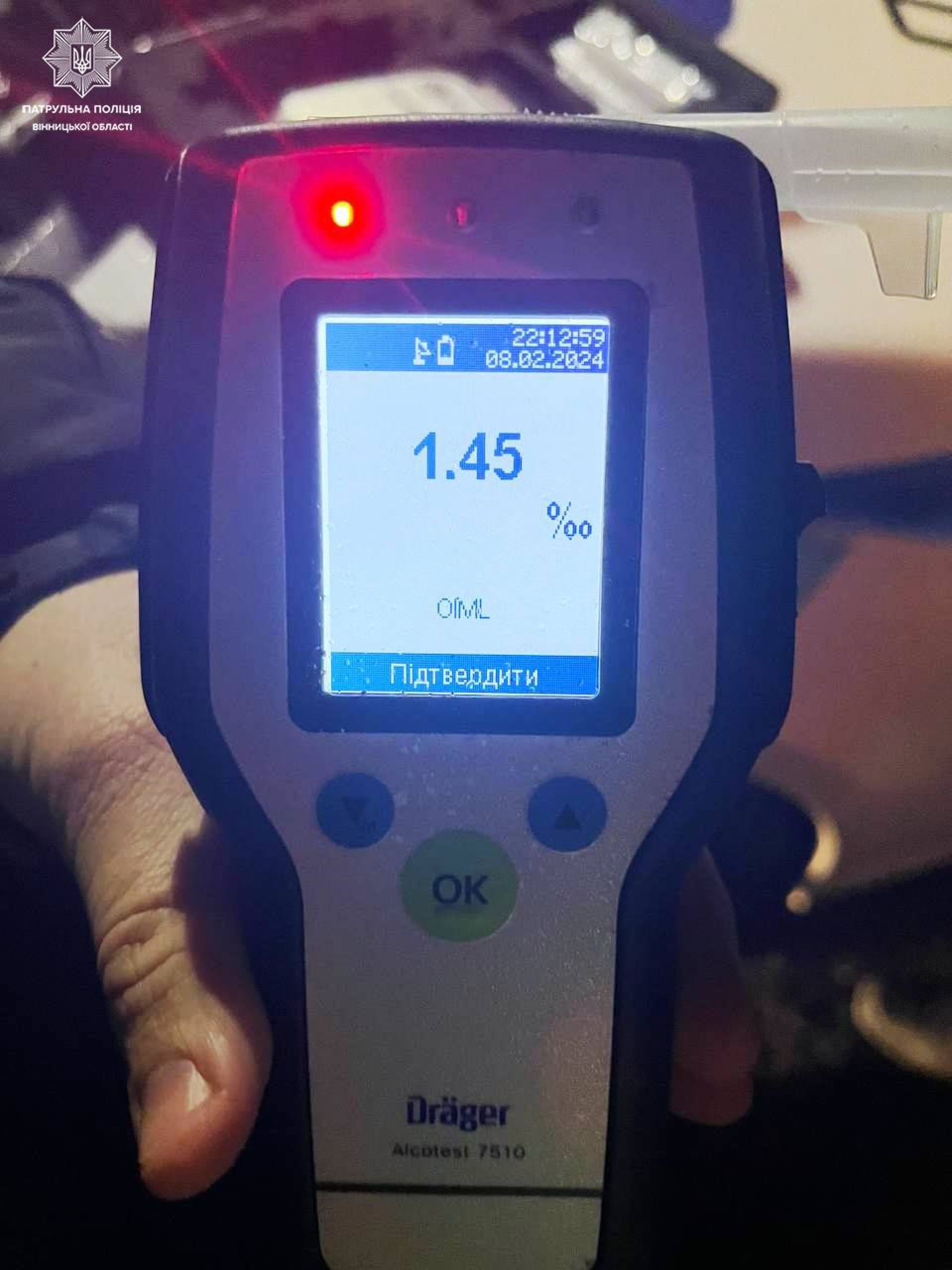 — Під час спілкування з 51-річним водієм інспектори помітили в нього ознаки алкогольного сп'яніння. Спецприлад Драгер показав 1,45 проміле алкоголю в організмі порушника, а це в сім разів більше норми, — зазначають у повідомленні.