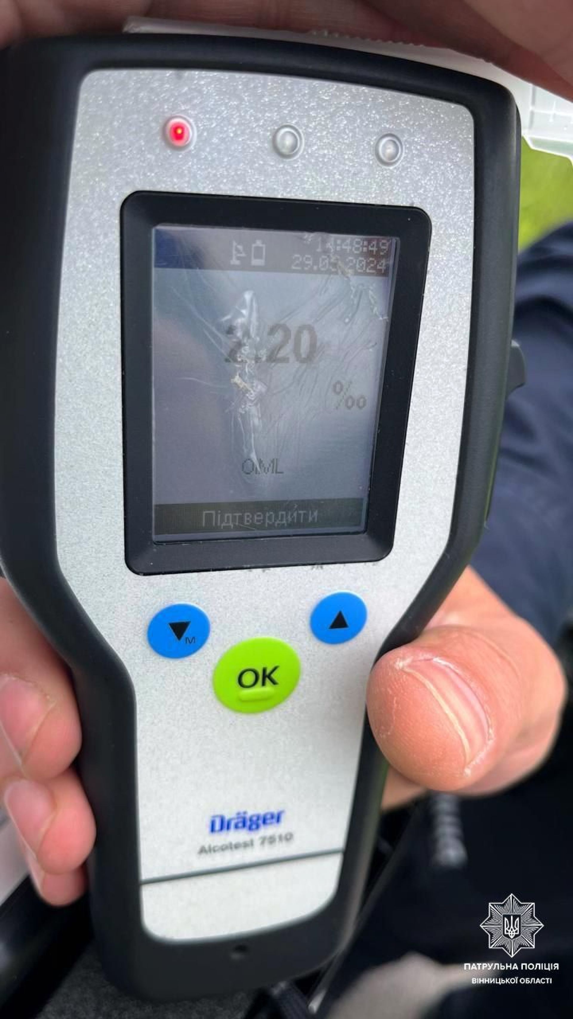 Інцидент стався вдень 29 травня у Калинівці. Як інформує патрульна поліція Вінницької області, чоловіка інспектори попросили пройти освідування на «Драгері». Результат тесту показав 2,20 проміле алкоголю в крові, що в 11 разів більше допустимої норми.