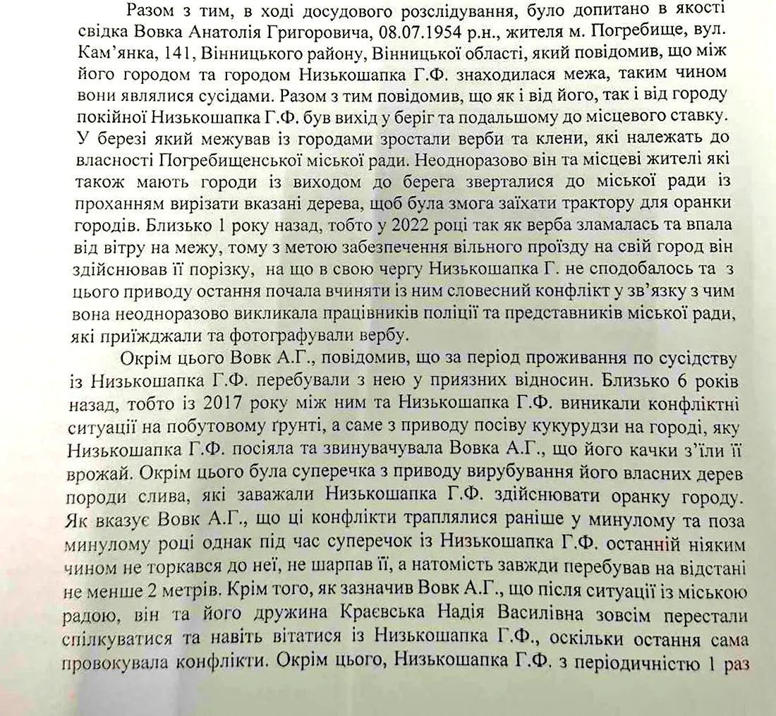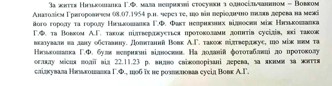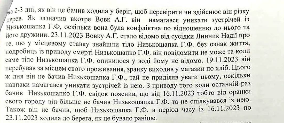 Також Вовк каже, що в день смерті Галини, її не бачив, і днями раніше з нею також не зустрічався, а востаннє її бачив ще 16 листопада 2023 року. А в день зникнення жінки (з даних справи, ймовірно, 19 листопада 2023 року — авт.) лише ходив вранці до магазину по хліб, а решту дня залишався у власному домі.