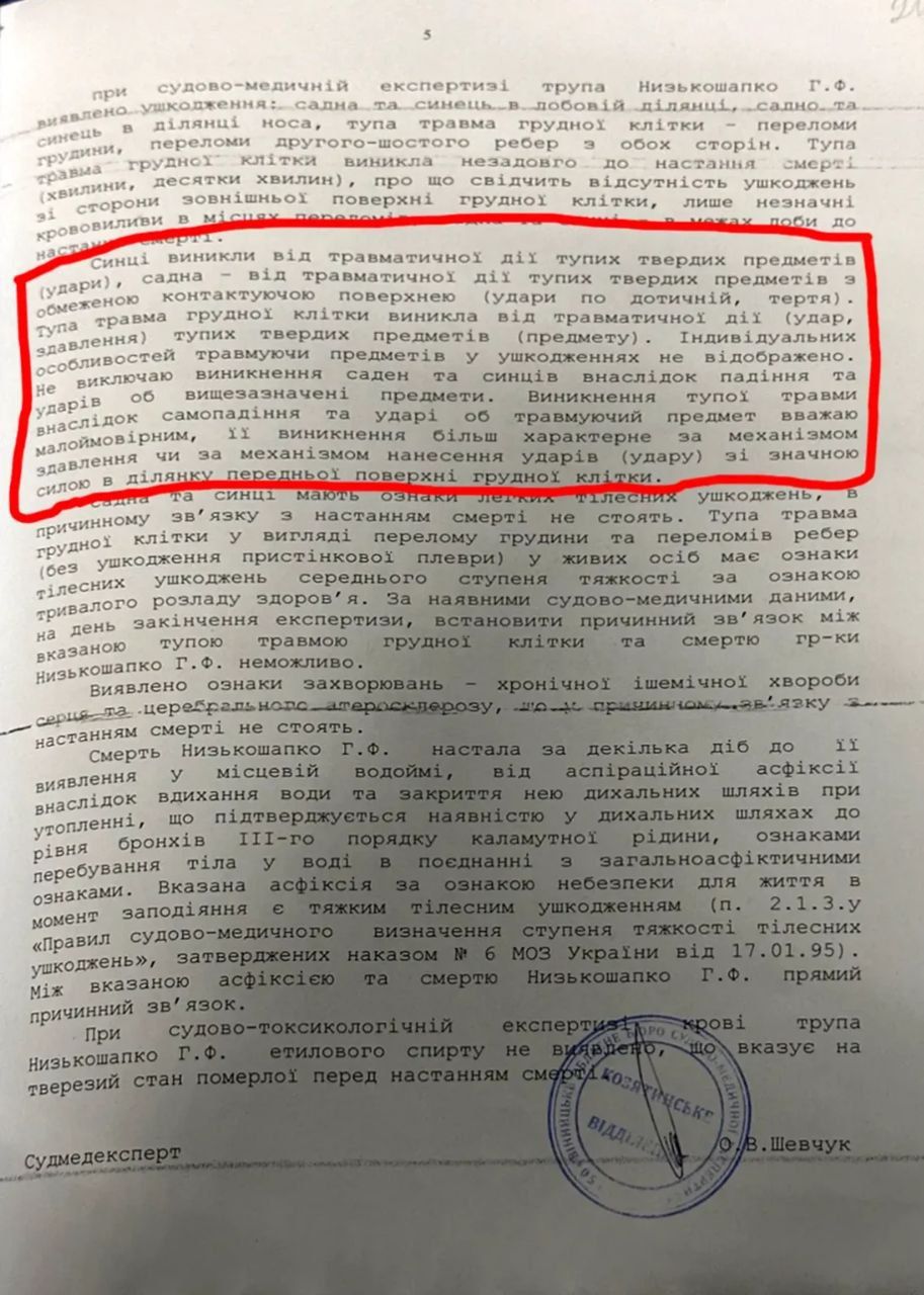 А у результатах судмедексперта взагалі вказувалось, що в жінки за декілька годин до смерті були насічені травми на лобі та в ділянці носа. Крім того встановлено: вона мала переломи грудини та ребер з обох сторін. У заключенні вказується, що ці травми завдані тупим предметом і малоймовірно спричинені падінням. Смерть настала в результаті утоплення, однак ці травми отримані незадовго до смерті.