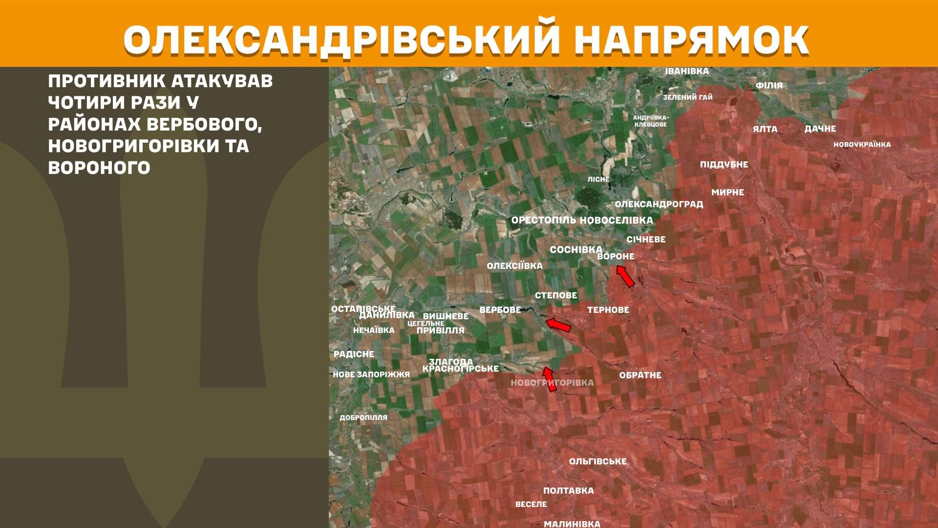 Найгарячіша ситуація наразі зберігається на Покровському та Костянтинівському напрямках. Наші воїни зупинили 20 штурмових атак поблизу Покровська, Удачного та Родинського, а також відбили 15 спроб ворога прорватися біля Костянтинівки та Плещіївки. На Слов’янському напрямку захисники заблокували 12 наступальних спроб окупантів, зокрема в районах Рай-Олександрівки та Дронівки. Одночасно з обороною українська авіація та артилерія завдали точних ударів по одинадцяти районах зосередження живої сили, знищили два пункти управління безпілотниками та засіб радіоелектронної боротьби ворога. На Гуляйпільському напрямку Сили оборони успішно відбили 12 атак, не давши загарбникам просунутися біля Мирного та Залізничного.
