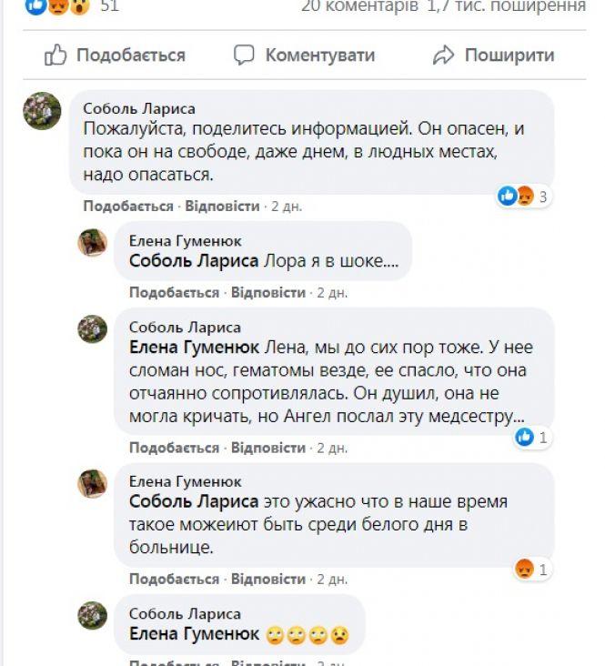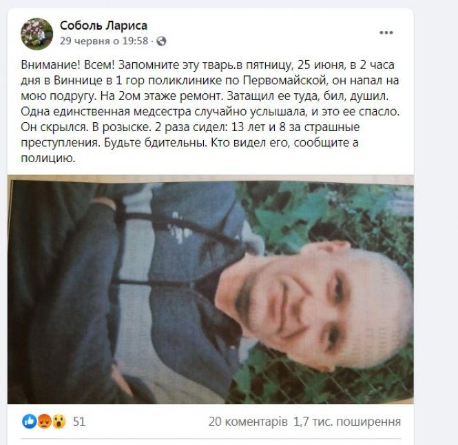 «Увага! Всім! Запам'ятайте цю тварюку. В п'ятницю, 25 червня, о другій годині дня у Вінниці в Першій міській поліклініці на Першотравневій він напав на мою подругу. На другому поверсі ремонт. Затягнув її туди, бив, душив. Одна єдина медсестра випадково почула і це її врятувало. Він втік. У розшуку. Два рази сидів: 13 років і 8 за страшні злочини. Будьте уважні. Хто бачив його, повідомте в поліцію», — читаємо в дописі.