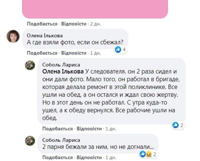 Вона також додає, що нападник, як виявилося, працював у бригаді, яка робила ремонт у поліклініці. А від слідчого отримала фотографію цього чоловіка.