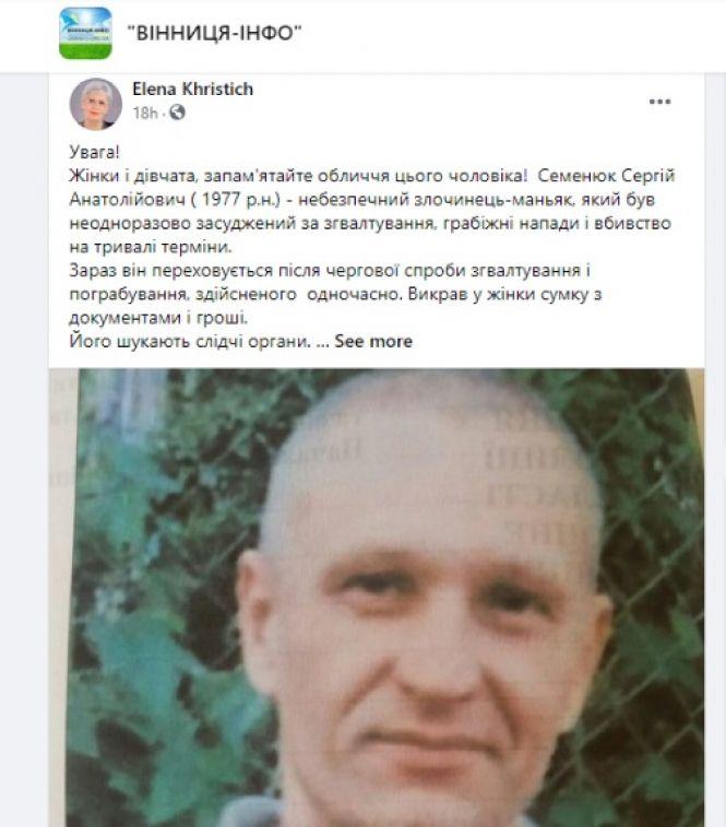 «Семенюк Сергій Анатолійович (1977 р.н.) — небезпечний злочинець-маньяк, який був неодноразово засуджений за зґвалтування, грабіжні напади і вбивство на тривалі терміни… Вкрав у жінки сумку з документами і гроші», — читаємо в дописі Олени.