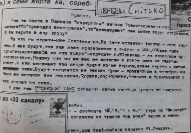 Потім схожий лист прийшов на адресу газети «33 канал». На цей раз хтось погрожував вибухами у вінницькому електротранспорті. Аби цього уникнути, анонім вимагав 300 тисяч доларів.