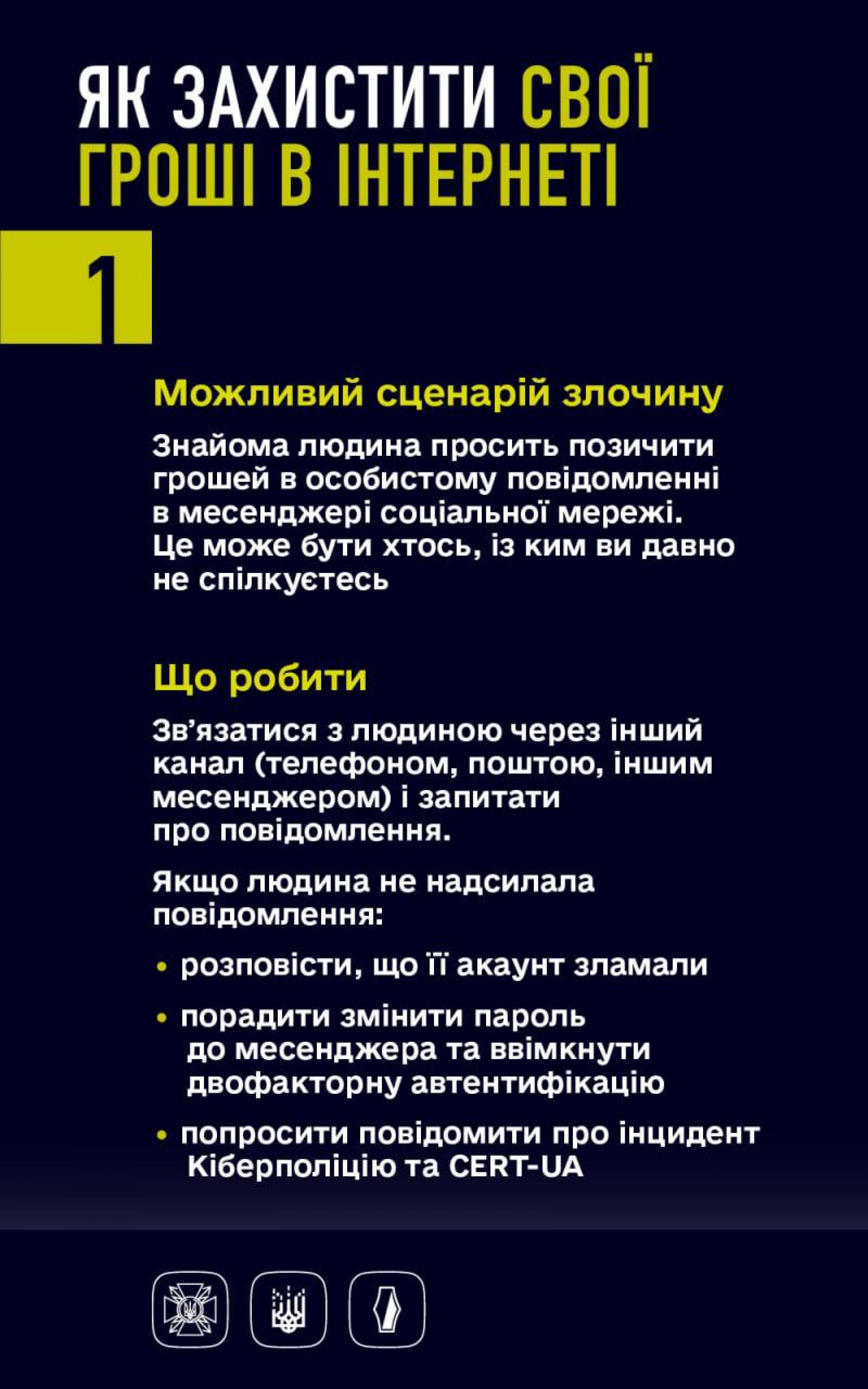 «Під час війни зловмисники постійно спекулюють на темі фінансової допомоги українцям, які постраждали від дій рф. Або просять кошти нібито на допомогу Збройним Силам чи землякам, які постраждали від війни, або ж для “отримання” такої допомоги виманюють дані карток, з яких потім знімають всі гроші», — кажуть в МВС.