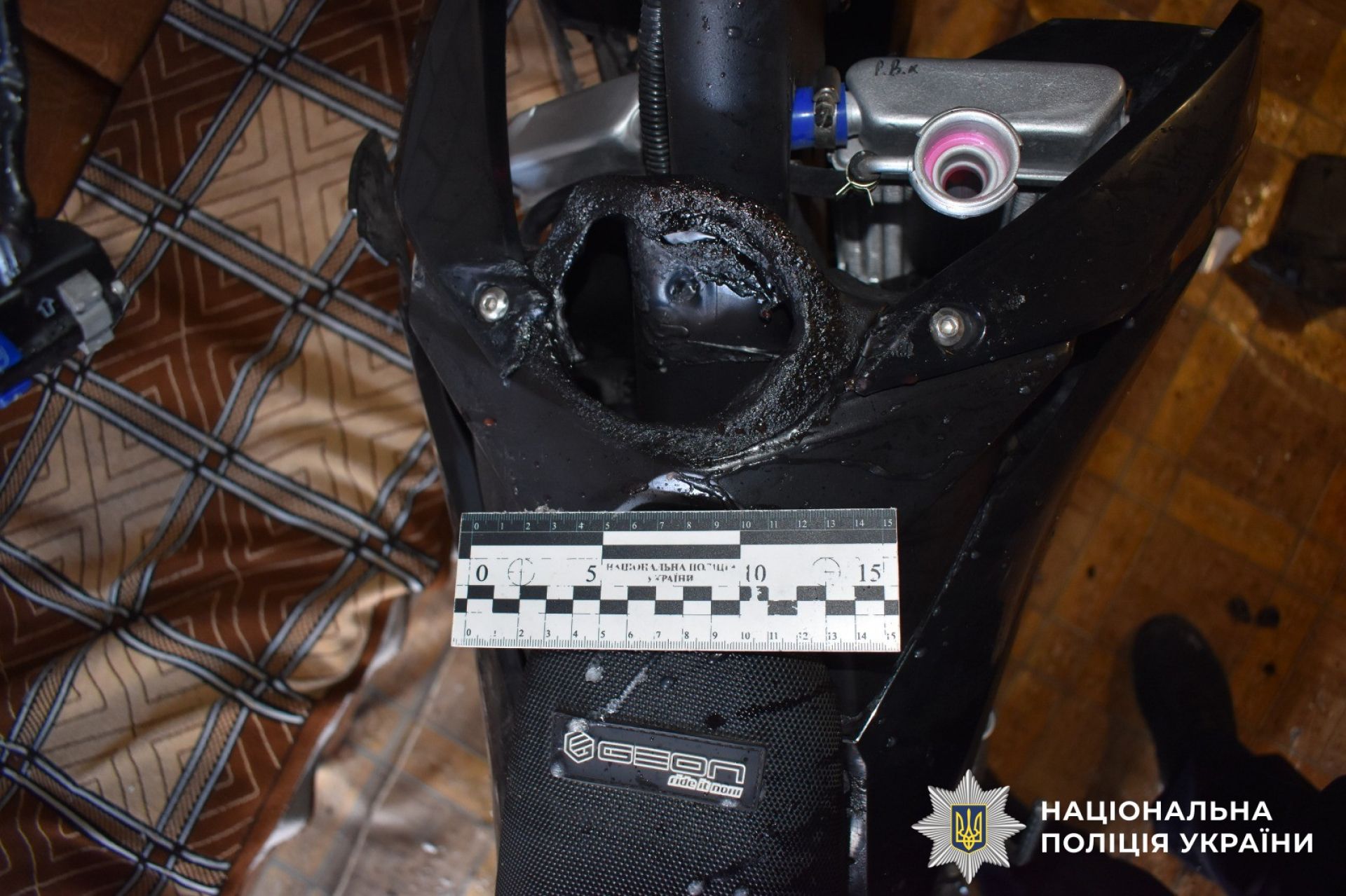 Щоб знищити транспорт суперника, палій використав бензин. Він облив мотоцикл марки «GEON» та підпалив його.