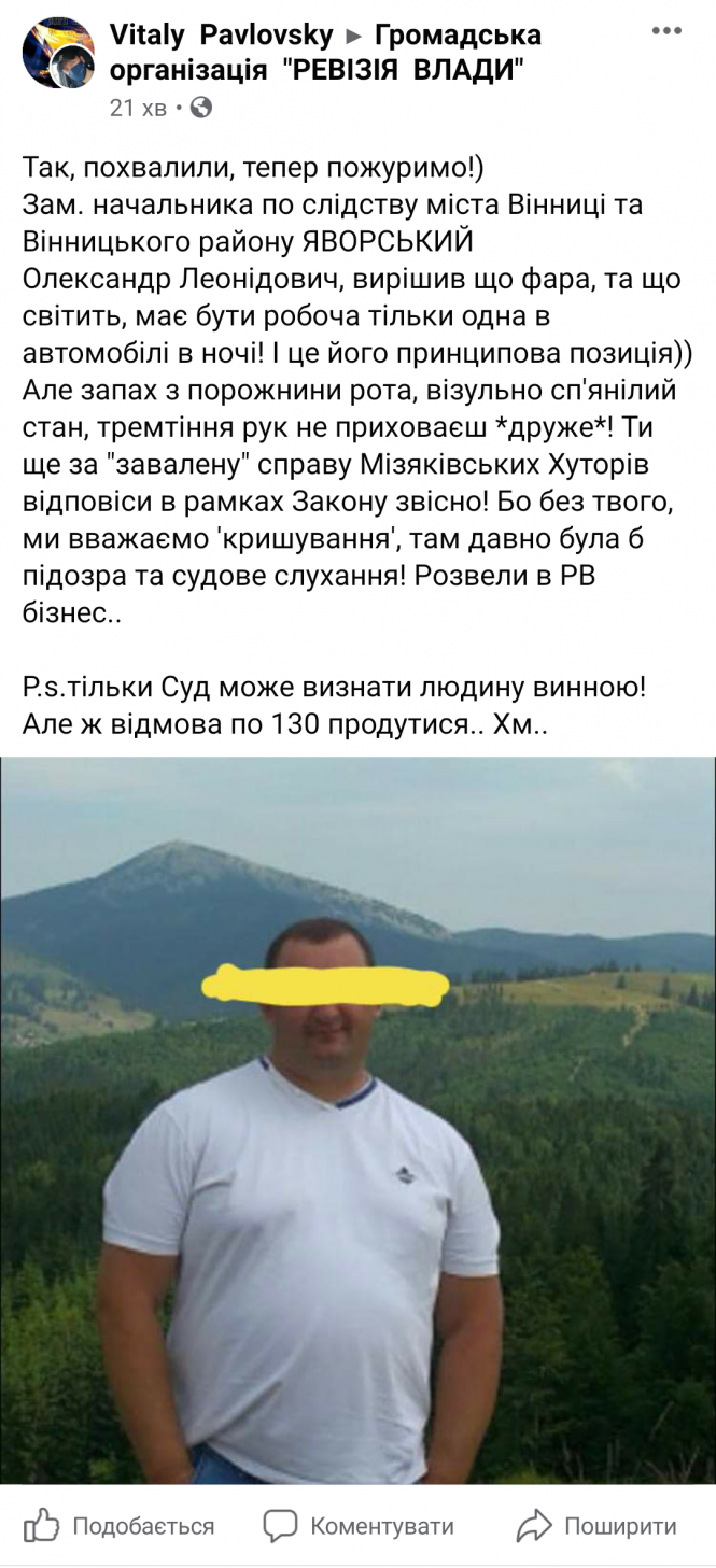 Олександр Леонідович, вирішив, що фара, та що світить, має бути робоча тільки одна в автомобілі в ночі! І це його принципова позиція, — цитуємо повідомлення Віталія. — Але запах з порожнини рота, візуально сп'янілий стан, тремтіння рук не приховаєш «друже»! Ти ще за «завалену» справу Мізяківських Хуторів відповіси! Бо без твого, ми вважаємо, кришування, там давно була б підозра та судове слухання! Розвели в РВ бізнес... P.s.тільки Суд може визнати людину винною! Але ж відмова по 130 продутися... Хм...»