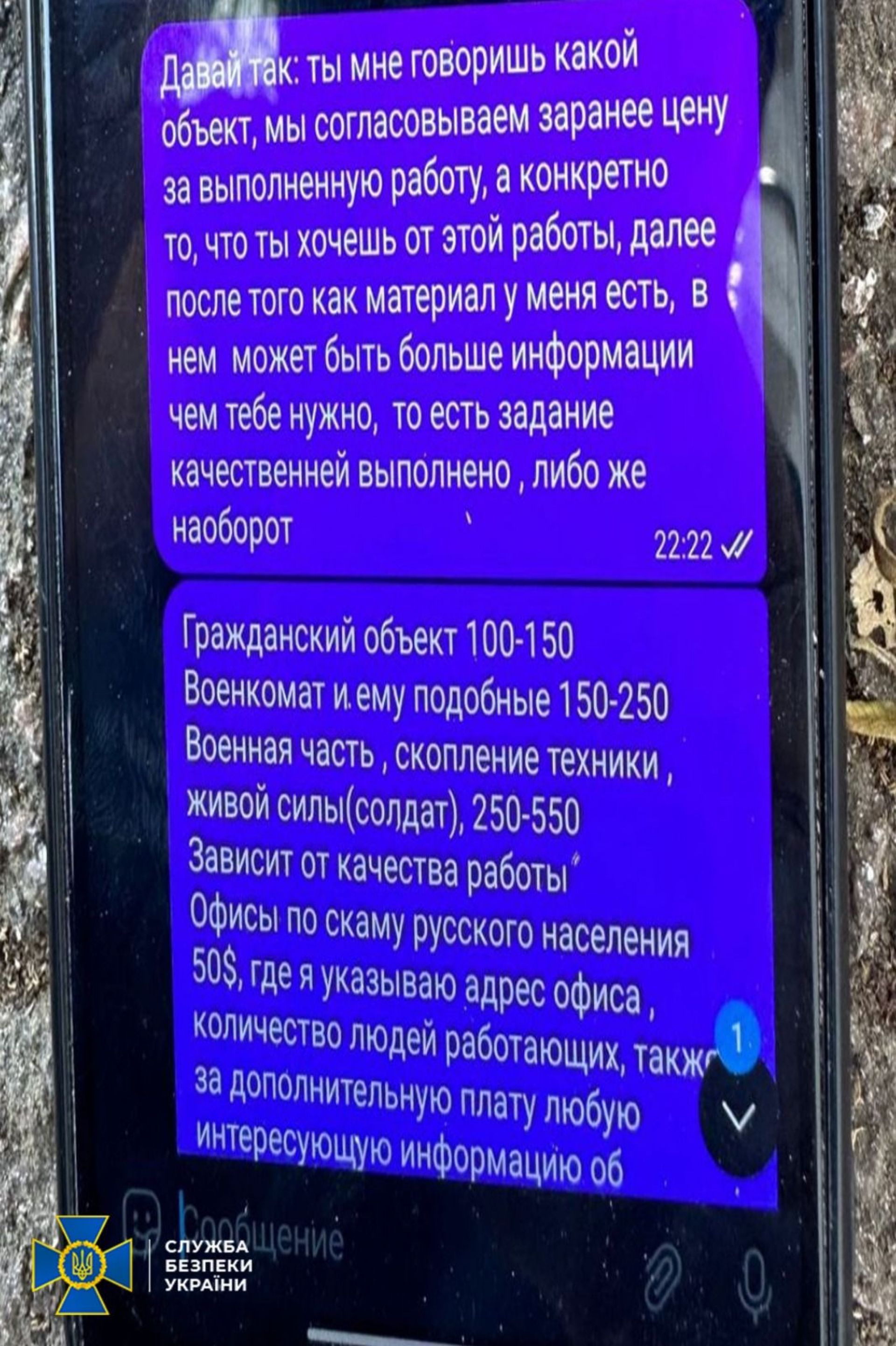 — За кожне виконання завдань російські агенти отримували від своїх керівників до 550 доларів на свої особисті банківські картки. Сума залежала від терміновості та якості виконаної «роботи», — інформує СБУ, — Зв'язок між російським спецслужбовцем та його спільниками підтримується через месенджери.