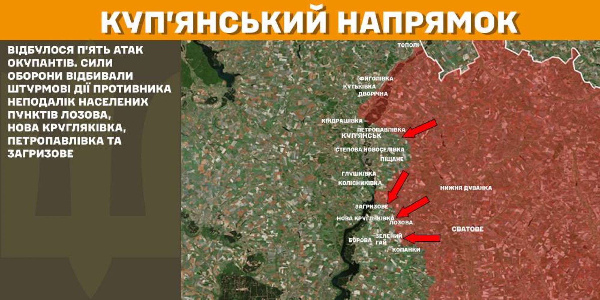 На Куп’янському напрямку минулої доби відбулося п’ять атак окупантів. Сили оборони відбивали штурмові дії противника неподалік населених пунктів Лозова, Нова Кругляківка, Петропавлівка та Загризове.