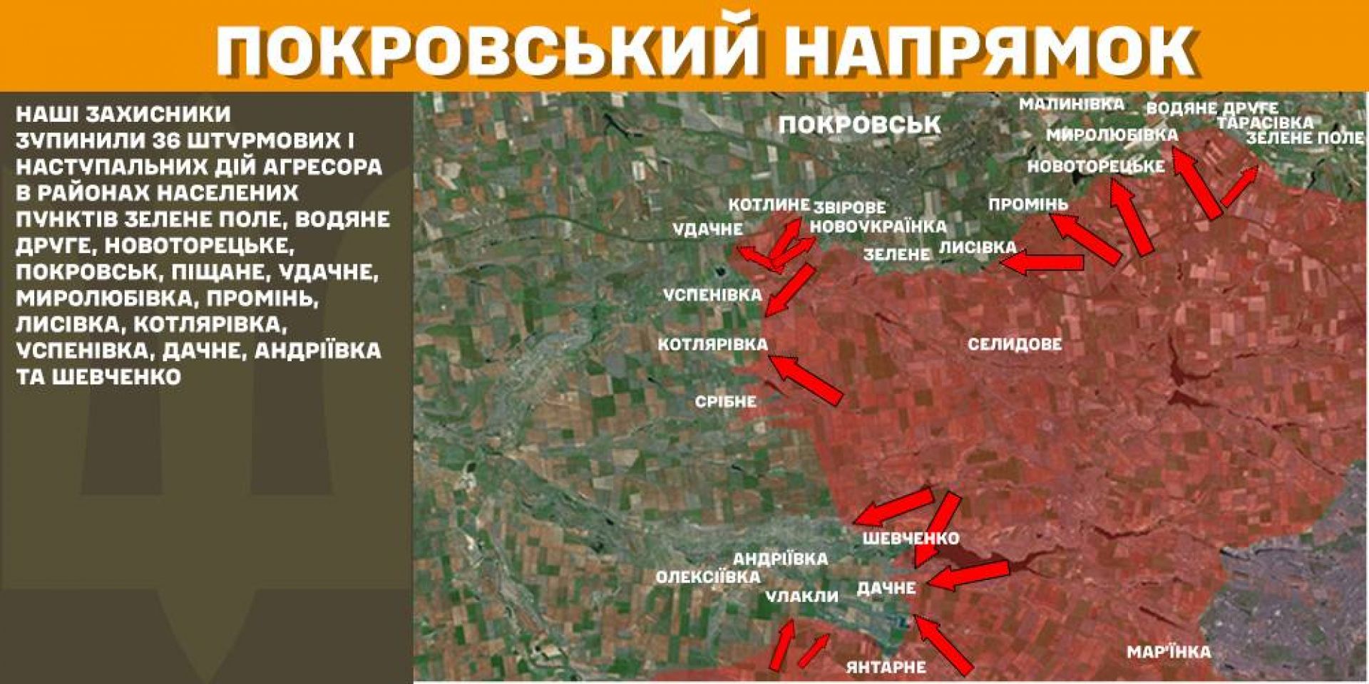 На Покровському напрямку наші захисники зупинили 36 штурмових і наступальних дій агресора в районах населених пунктів Зелене Поле, Водяне Друге, Новоторецьке, Покровськ, Піщане, Удачне, Миролюбівка, Промінь, Лисівка, Котлярівка, Успенівка, Дачне, Андріївка та Шевченко.