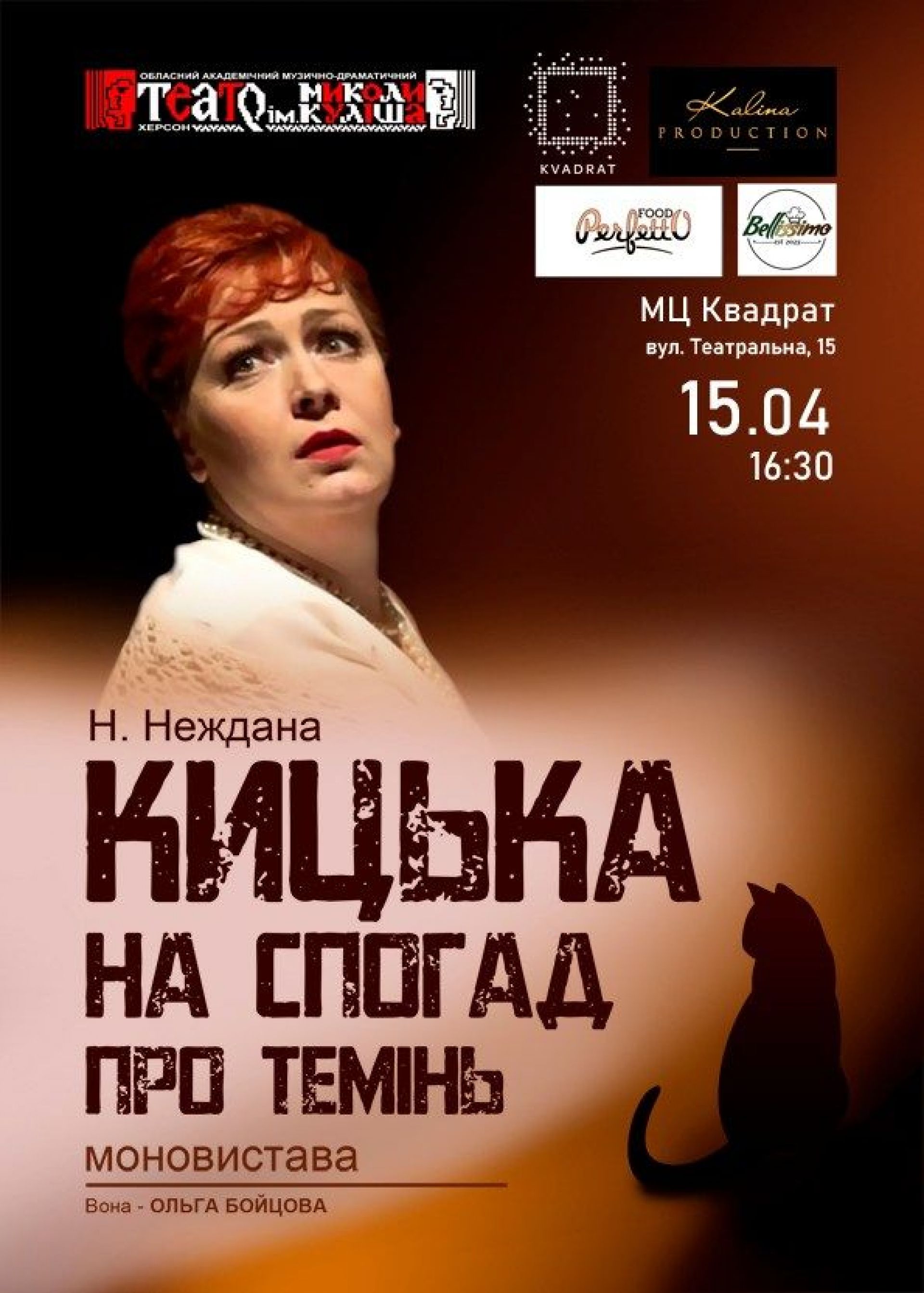 - У суботу, 15 квітня, о 16.30 у Вінницькому молодіжному центрі «Квадрат» презентують одну з найкращих своїх моновистав «Кицька на спогад про темінь».