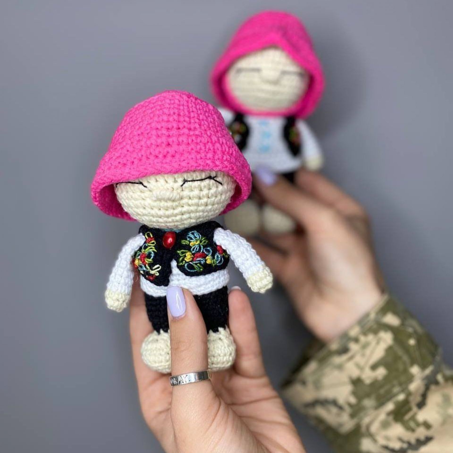 «Лялька фронтмена гурту «Калуш», що став цьогорічним переможцем на пісенному конкурсі Євробачення. Суцільно в’язана іграшка з напівбавовни, наповнювач — холофайбер, оченята — на безпечному кріпленні, жилет та панама вишиті»