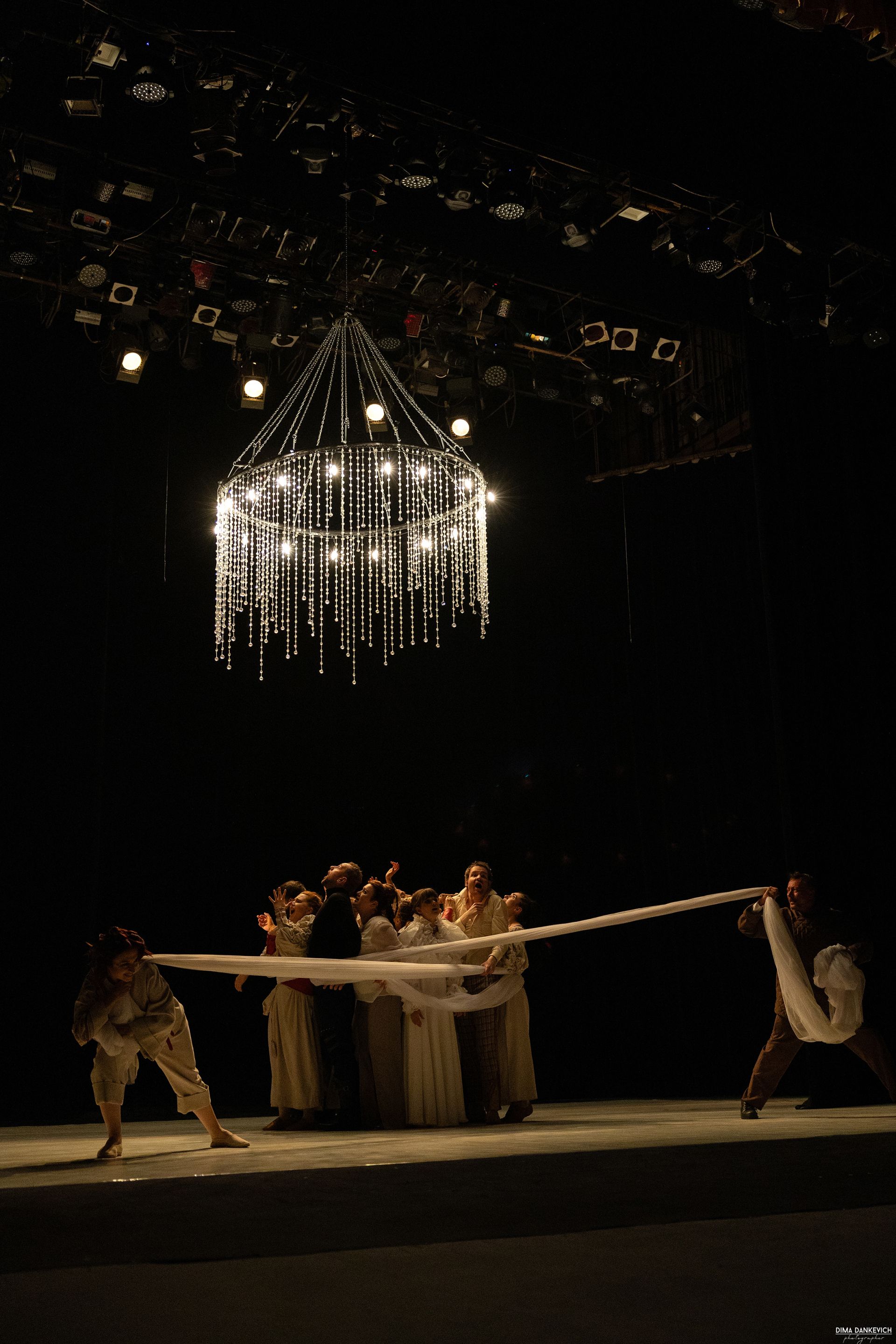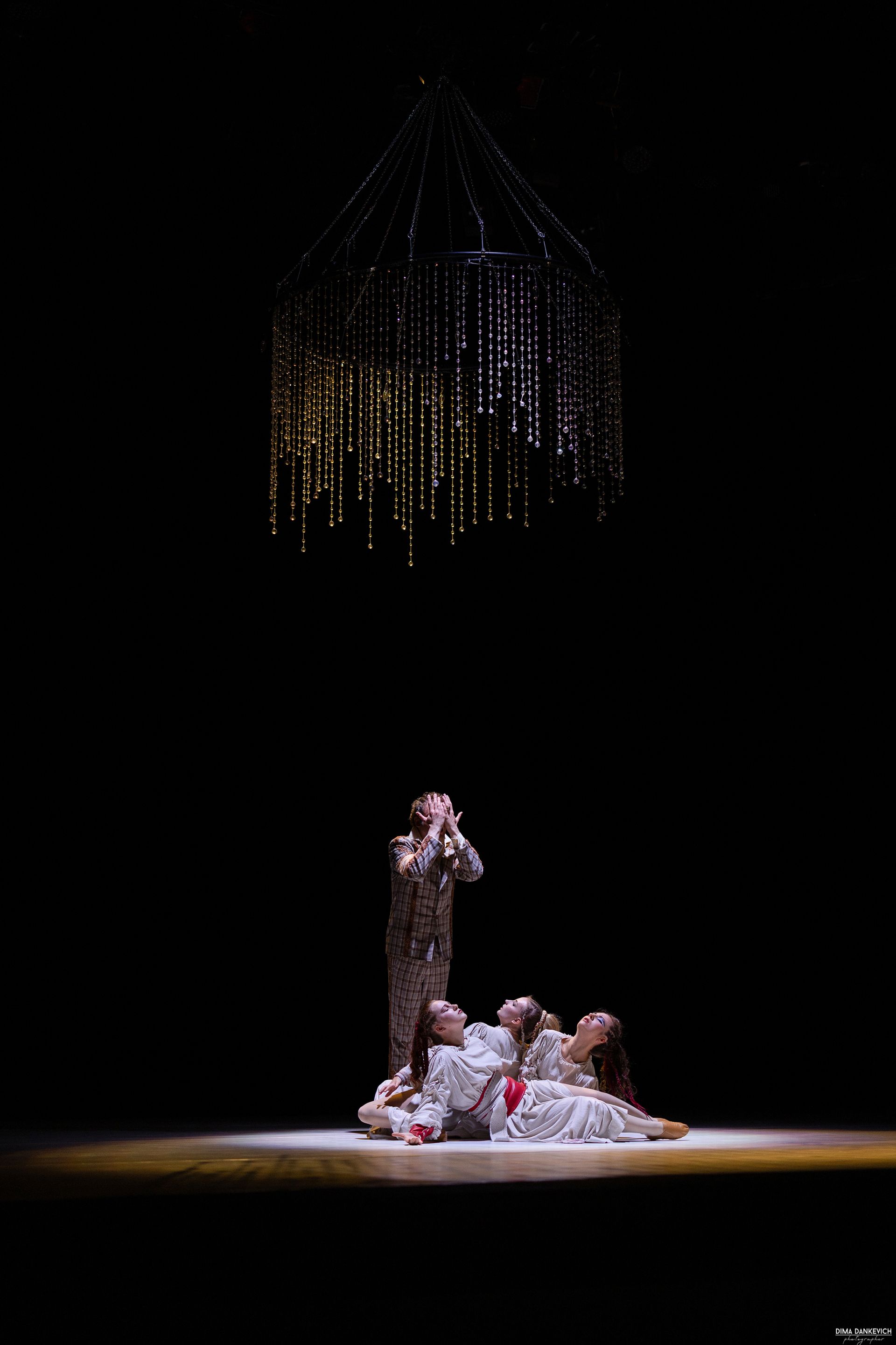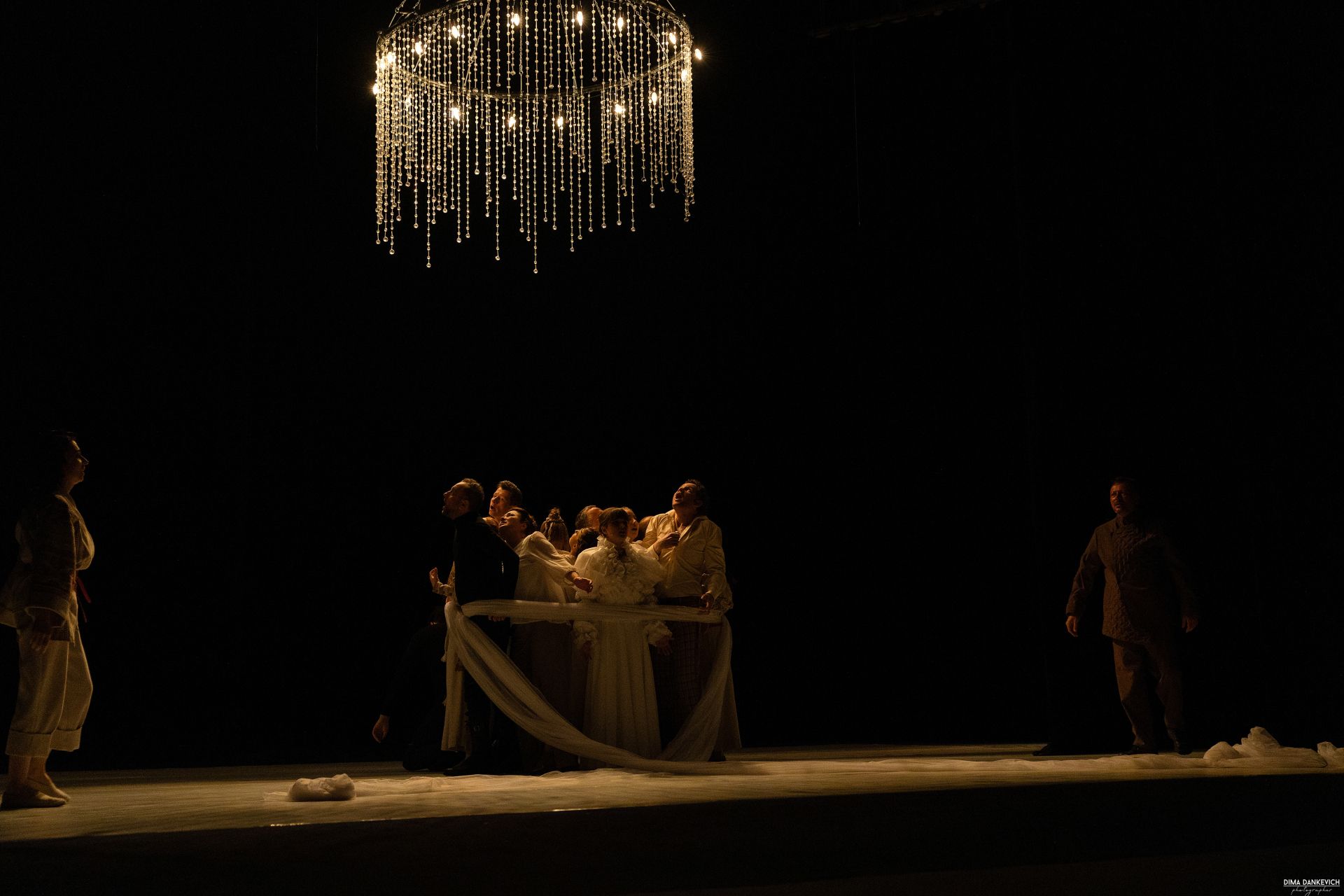 Величезна, розкішна люстра, як ключова декорація. Спершу — тиша, а потім — стильна, прониклива музика. Перша пластична сцена, де всі актори на сцені.