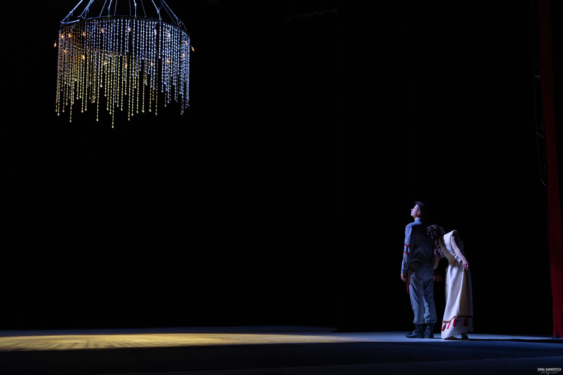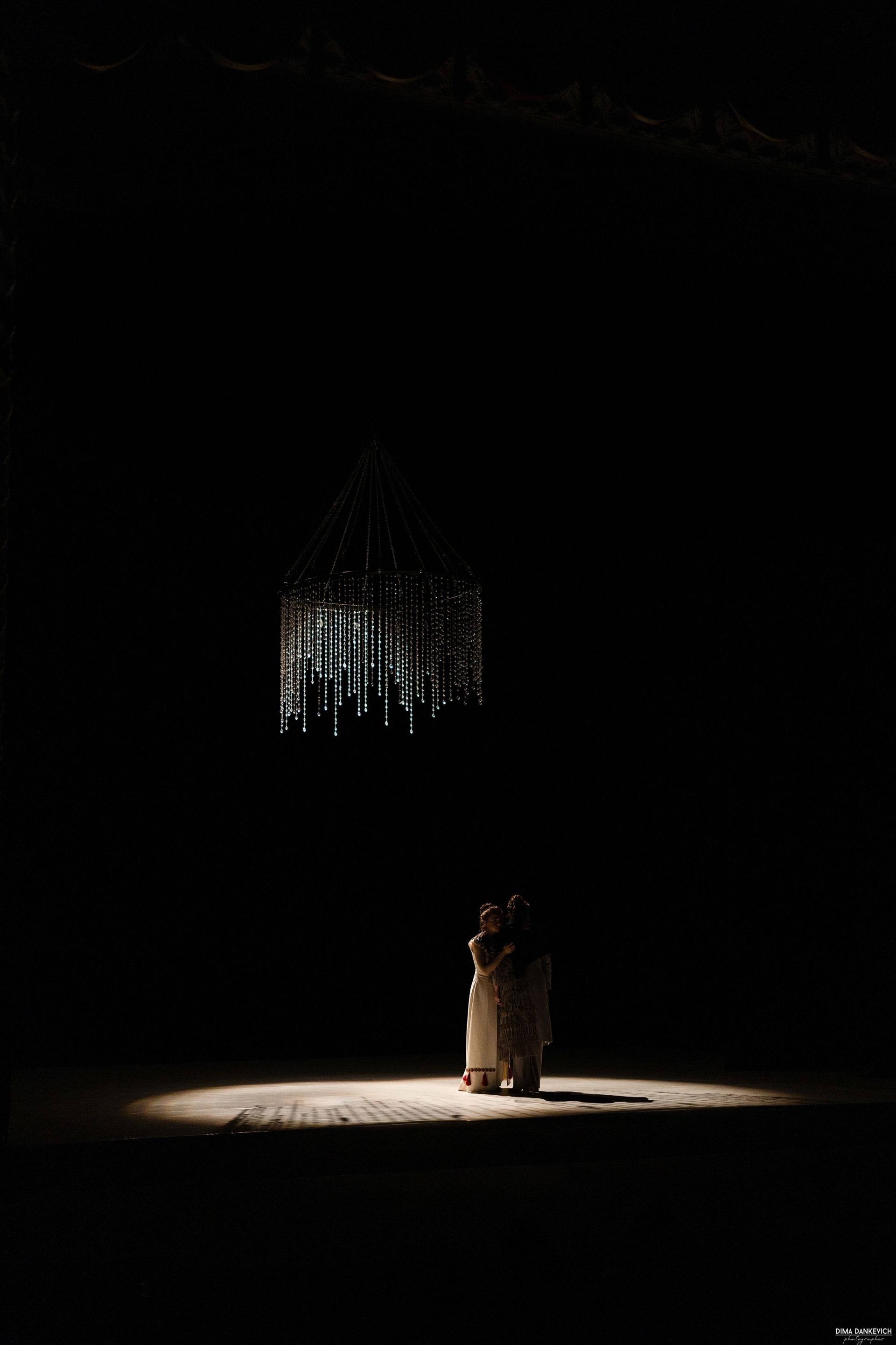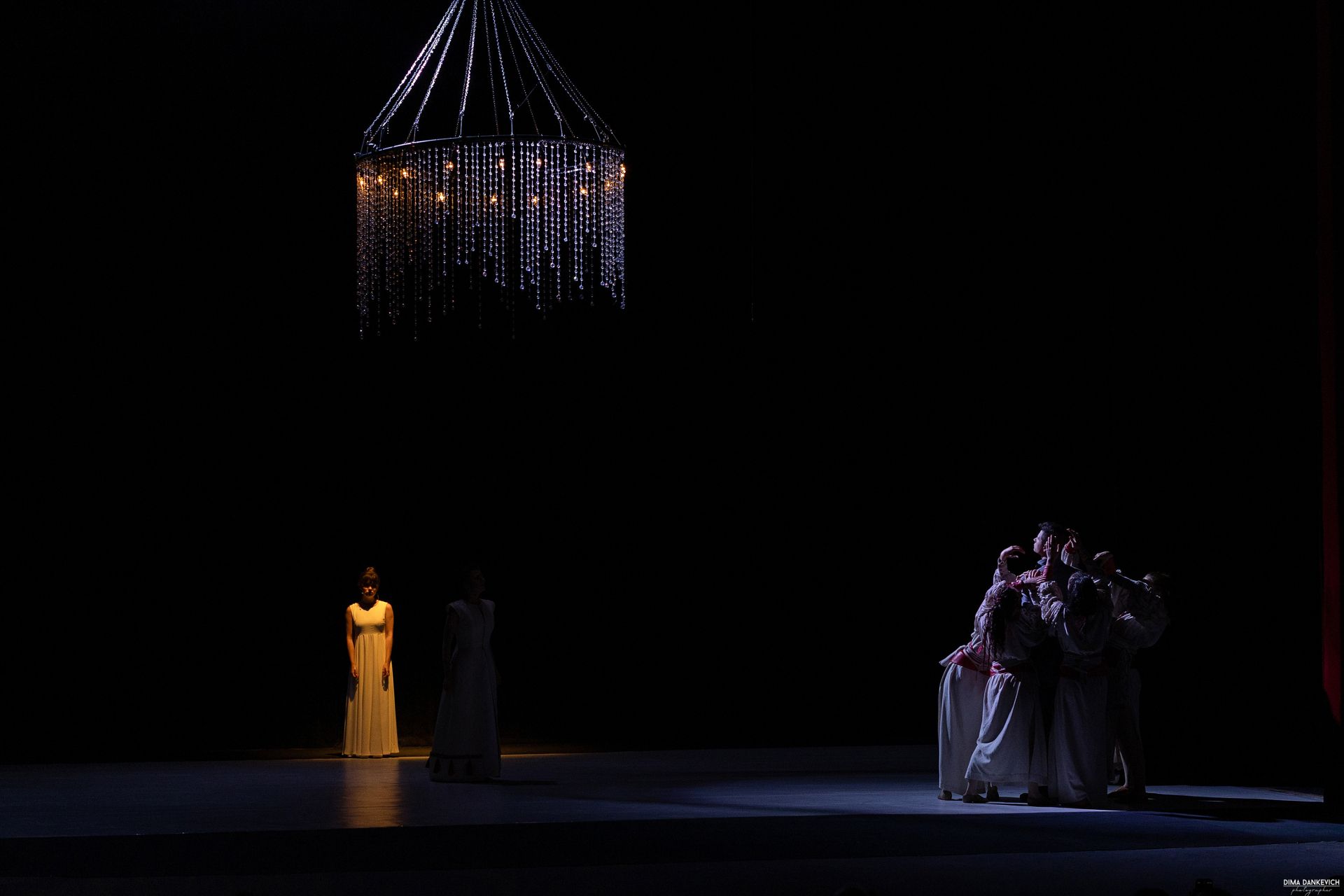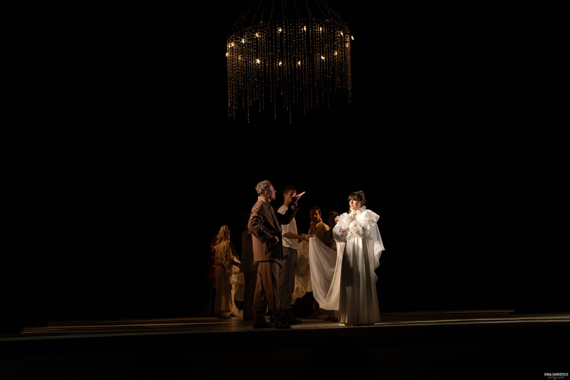 Величезна, розкішна люстра, як ключова декорація. Спершу — тиша, а потім — стильна, прониклива музика. Перша пластична сцена, де всі актори на сцені.