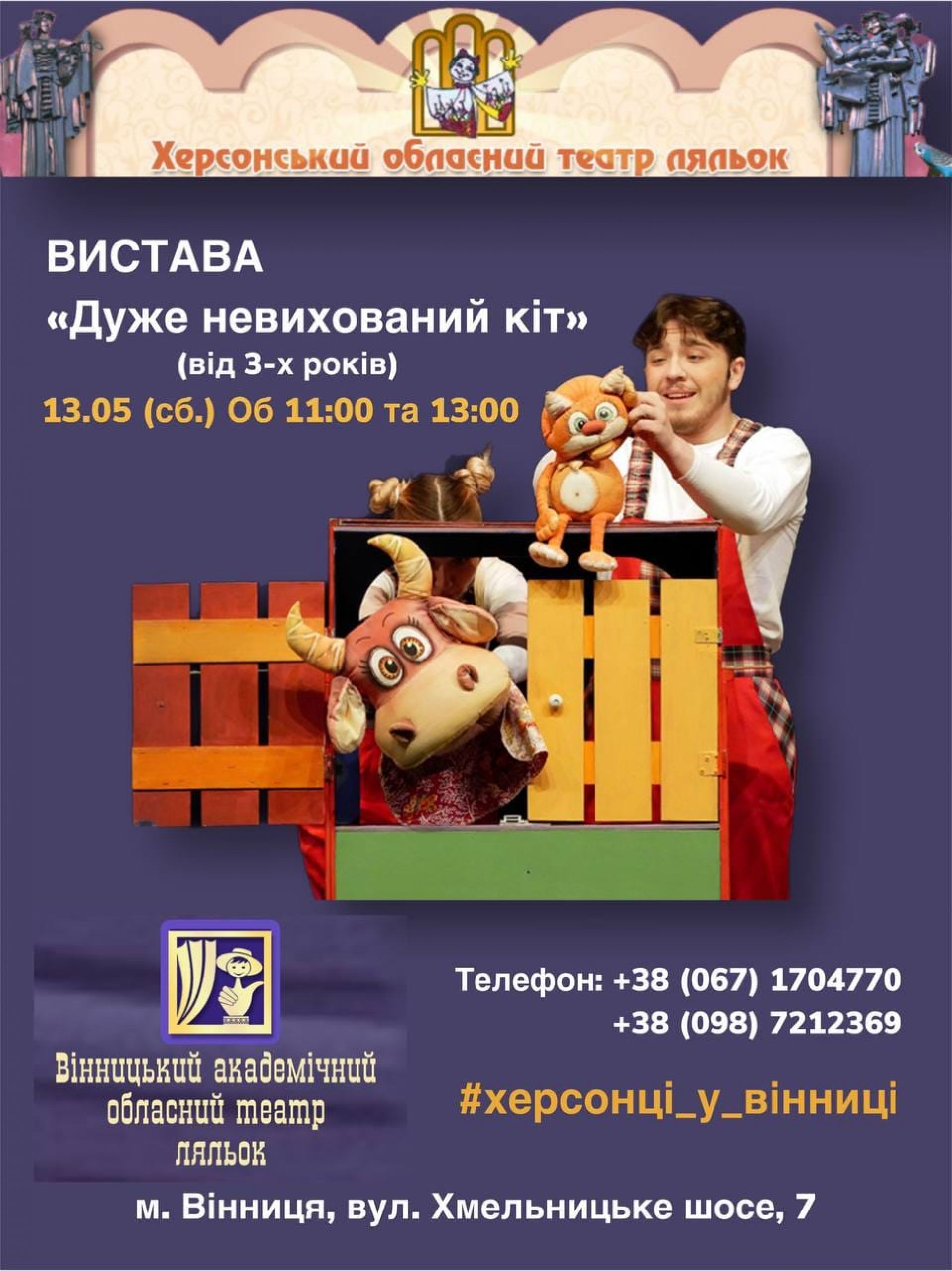 13 травня об 11.00 і 13.00 херсонські лялькарі запрошують усіх на яскраву інтерактивну повчальну казку «Дуже невихований кіт», яку, до речі, всього кілька тижнів тому з успіхом презентували на 10-му міжнародному театральному фестивалі «Схід—Захід» у польському Кракові.