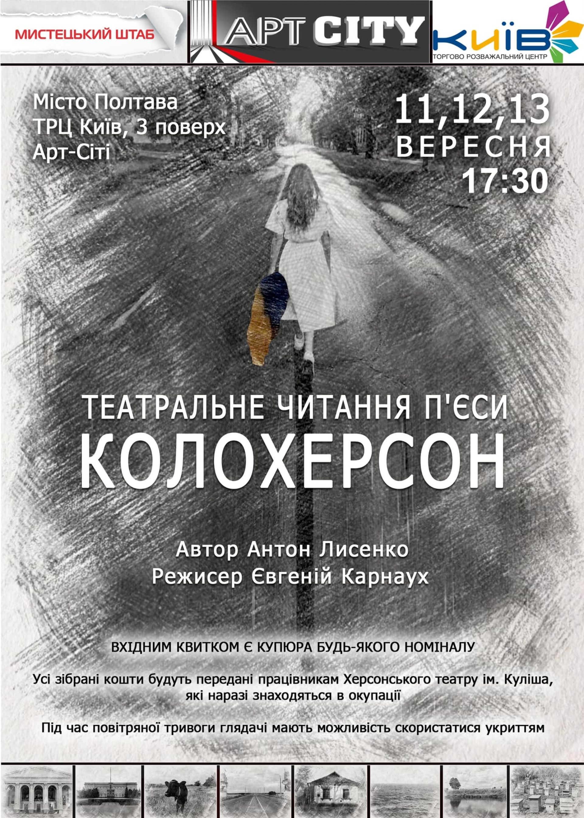 — «Blackaut» — третя моя постановка за час повномасштабної війни. У вересні у Полтаві ми з актрисою Олею Марфіною робили перформативне читання п’єси «КолоХерсон», яку написав Антон Лисенко. Саме цією виставою відкрили воєнний театральний сезон Херсонського театру імені Куліша і збирали кошти на підтримку колег, які на той час залишались в окупації у Херсоні. У Полтаві є класне місце — ТРЦ Київ в «Арт-Сіті», де на волонтерські події чи збір грошей на ЗСУ приміщення надають безкоштовно. Тож там все і організували. Грошей насправді зібрали небагато. Якщо цинічно оцінювати, то було би вигідніше, якби просто зібрали кошти з себе і додали те, що витратили на цю постановку. Але з точки зору того розголосу, який був наданий, і що потім це трансформувалось у волонтерські напрямки у самому Херсоні, мені здається, це все ж таки було корисно. Цікавий досвід!