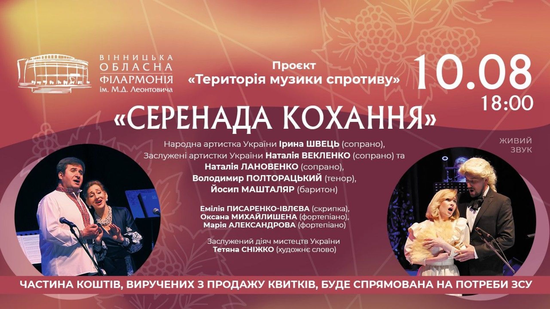 У четвер, 10 серпня, о 18.00 у філармонії вінничан і гостей міста чекає «Серенада кохання» — яскравий концерт про літо, любов та її безмежні відтінки.
