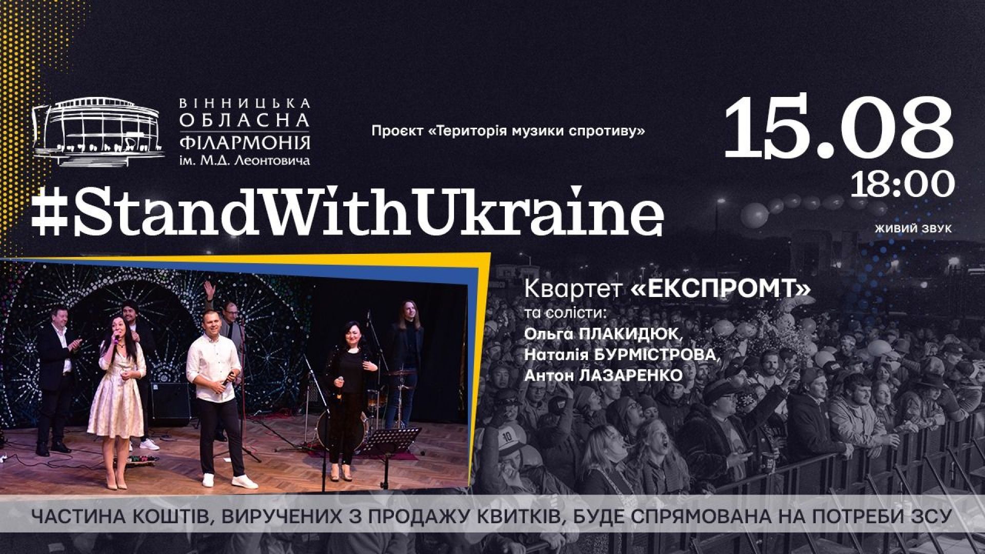 — Назва концерту «Stand With Ukraine» символічна, адже у ній зосереджена велика міць всеосяжної допомоги кожної свідомої людини з усього світу, численних масштабних акцій по усій планеті для посилення нашого опору, — відзначають у філармонії. — Дев'ять років тому в нашу країну прийшла війна. Вже майже півтора роки під незгасаючим вогнем Україна стоїть непохитною стіною перед навалою орди, захищаючи весь цивілізований світ від найбільшого зла XXI сторіччя. Але, щоб ця стіна вистояла, весь світ має стояти разом з нами! Із початку повномасштабного вторгнення росіян в Україну звичайні люди та світові зірки стали на підтримку українського народу. У знак глибокої вдячності всім, хто разом з нами, квартет «Експромт» та солісти філармонії 15 серпня на концерті «Stand With Ukraine» співатимуть пісні артистів та колективів, які допомагають Україні. Продовжуймо стояти, тримаймо стрій, бо разом ми непереможні!