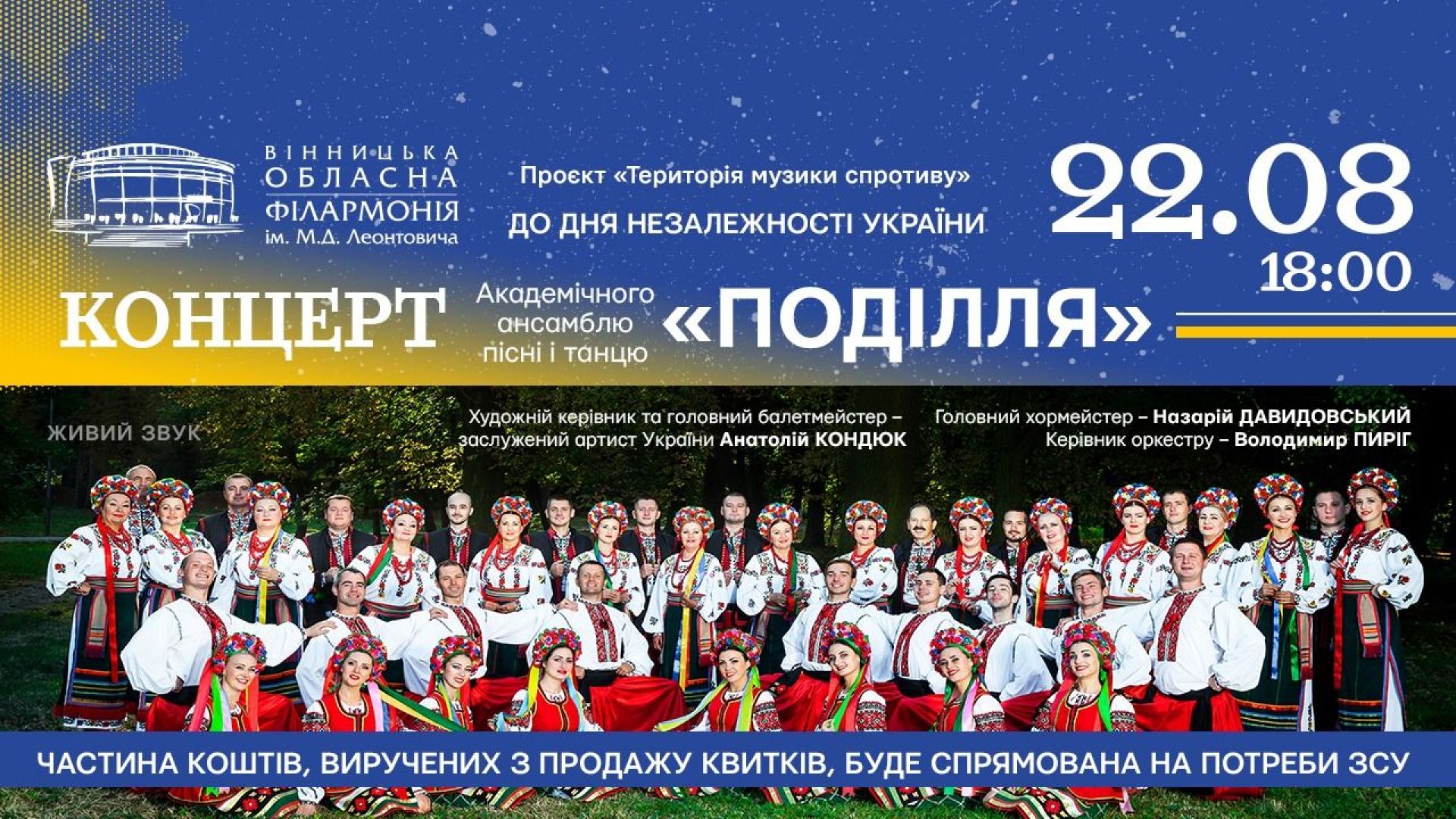 22 серпня о 18.00 у філармонії пройде особливий концерт Академічного ансамблю пісні і танцю «Поділля» до Дня незалежності України.